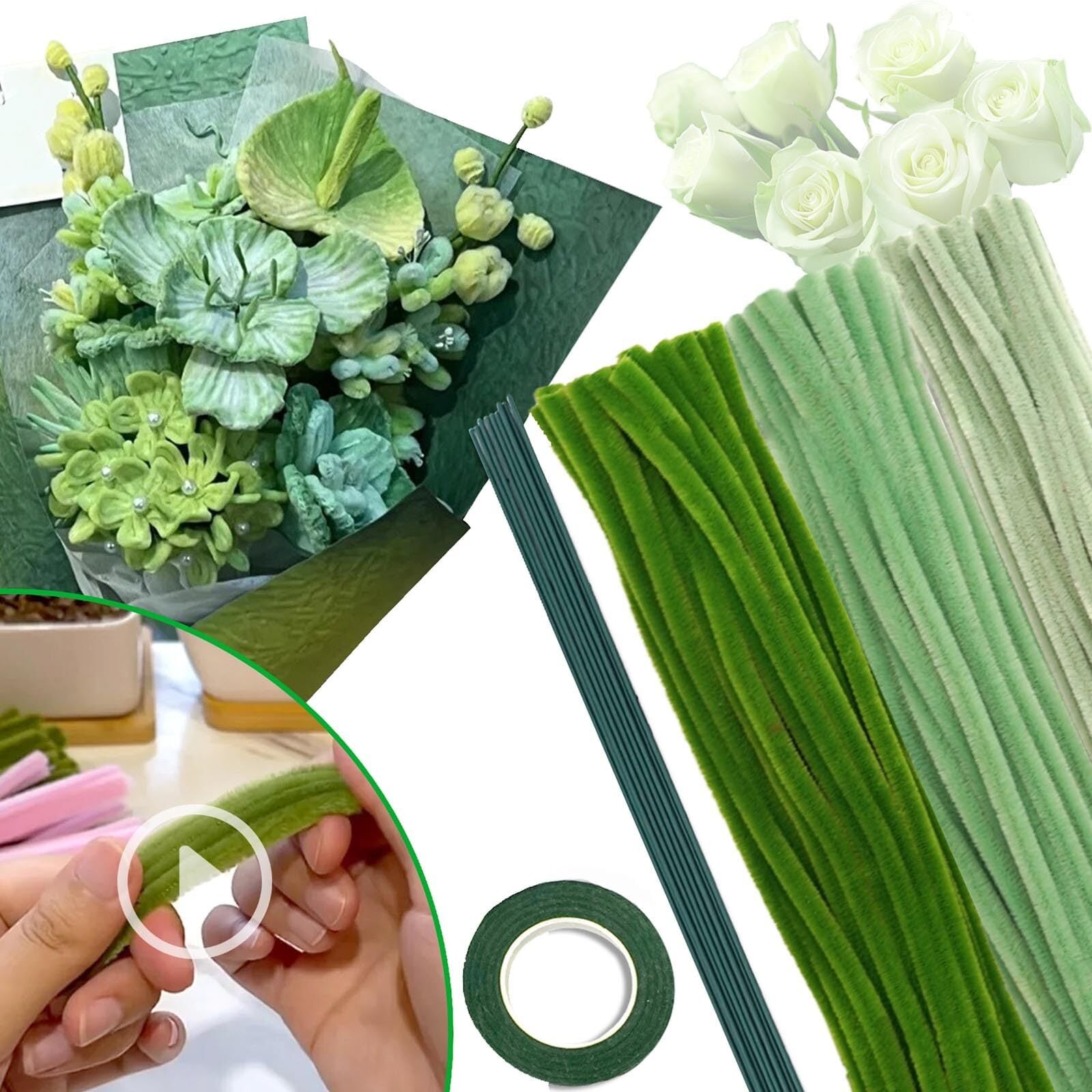 手芸モール フラワーモール カラーミックス 工作 モール 300本 6mm 花束 モールフラワー キット 人工花茎10本とフラワーテープ 緑1巻と DIY 飾り物 造形材料 学校 手作り素材 手芸 用品 記念日 誕生日 母の日 バレンタインデー 贈り物 (グリーンセット)