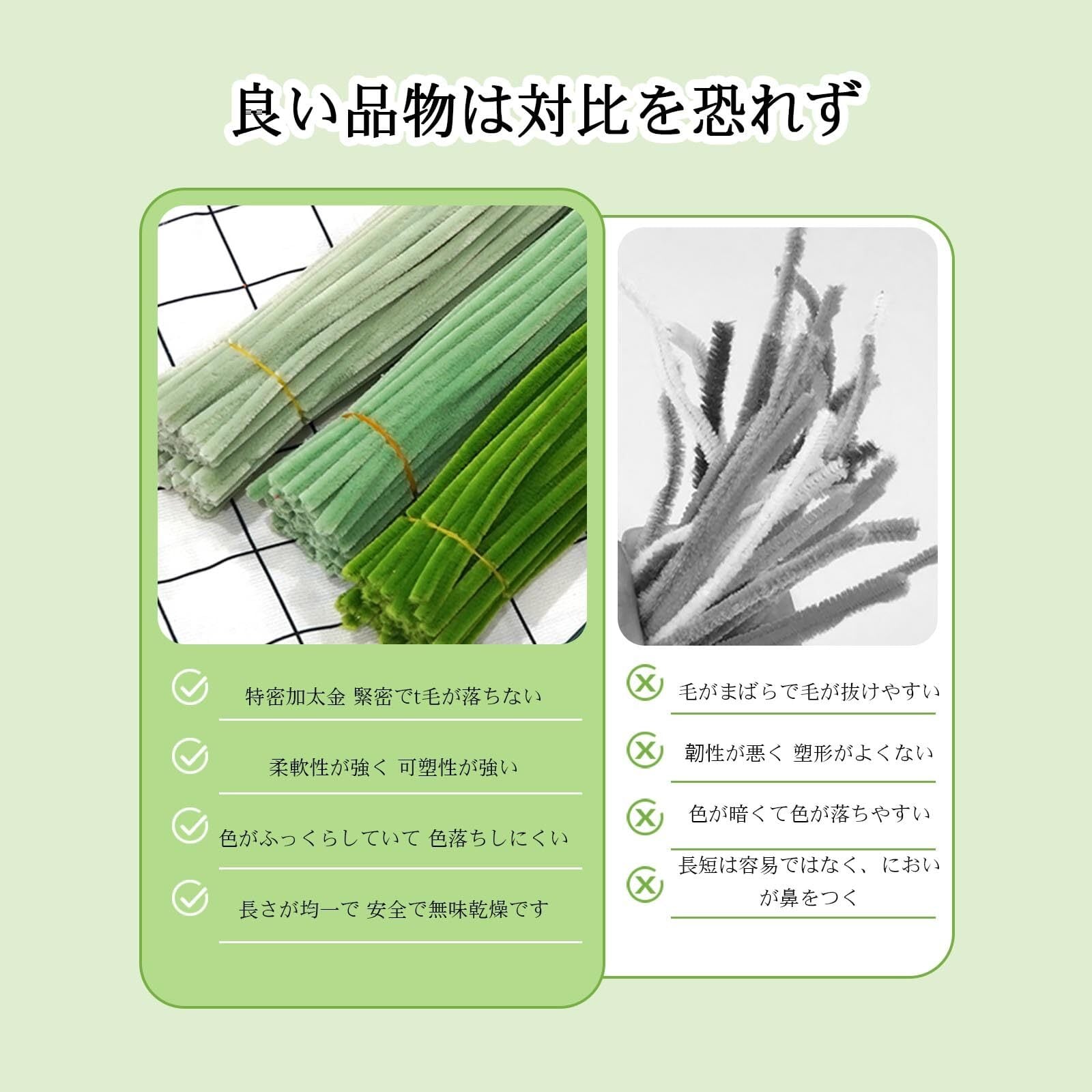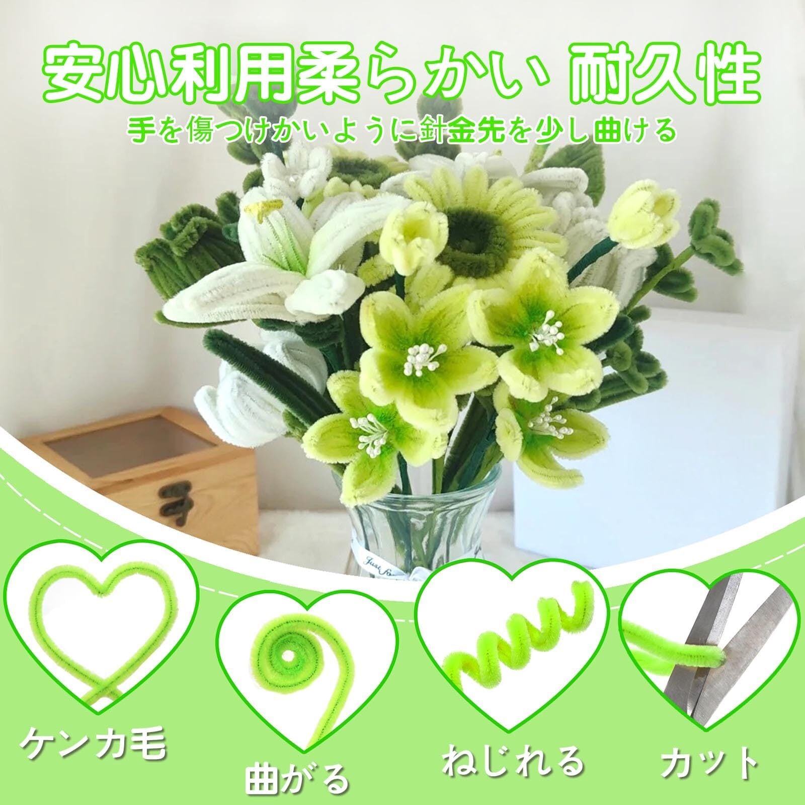 【高品質手芸】当社の手芸モールはポリエステル糸と鉄線で作られています、柔軟性があり任意に折り曲げたり、ねじったり、切ったりできます、色は鮮やかで色褪せにくいです。
