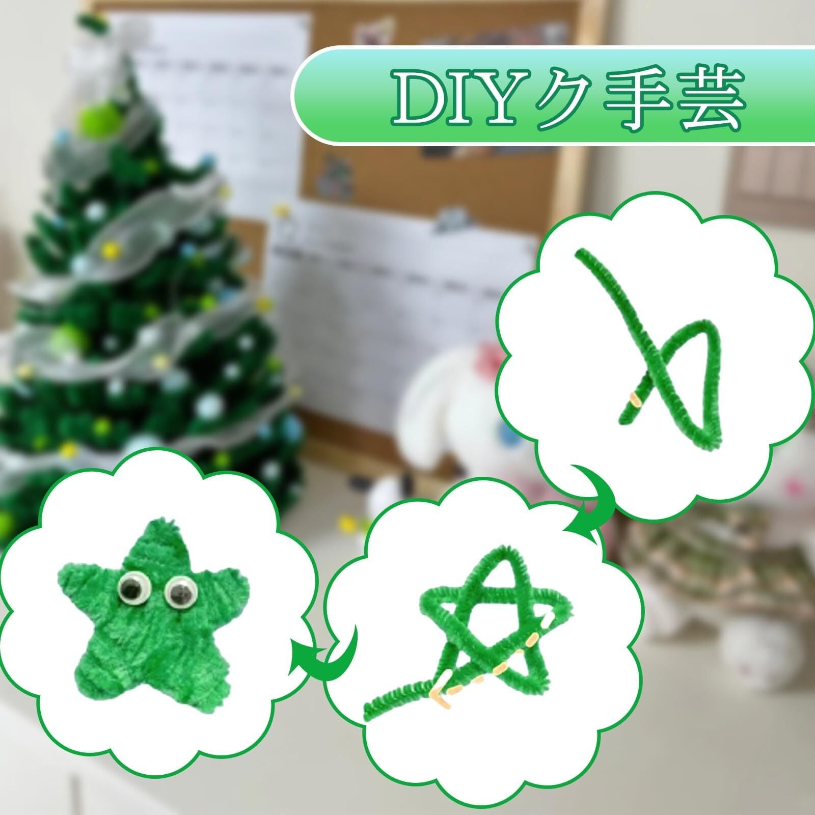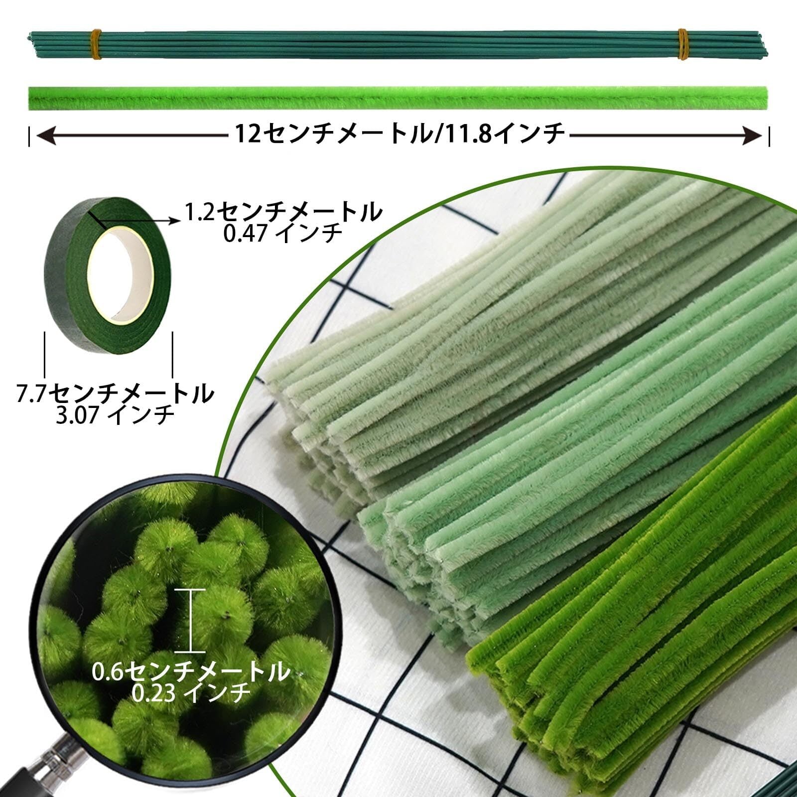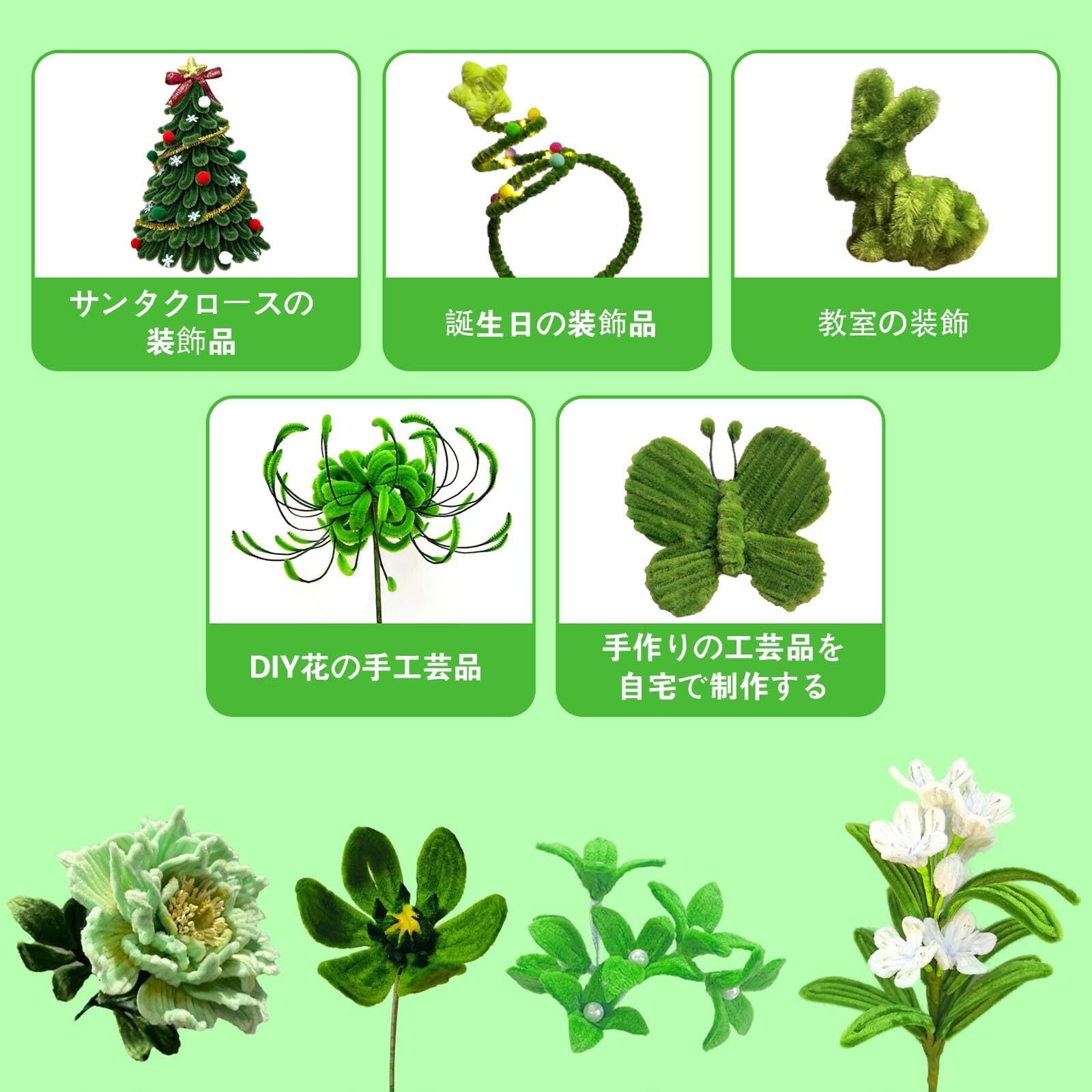 【商品仕様】6 つのセットからお選びいただけます。各セットには、手芸モール 300 本 (3 色各 100 本)、濃い緑色の造花の茎10 本、フローラルテープ 1 巻が含まれており。サイズ:手芸モール約長さ30cm、幅6mm