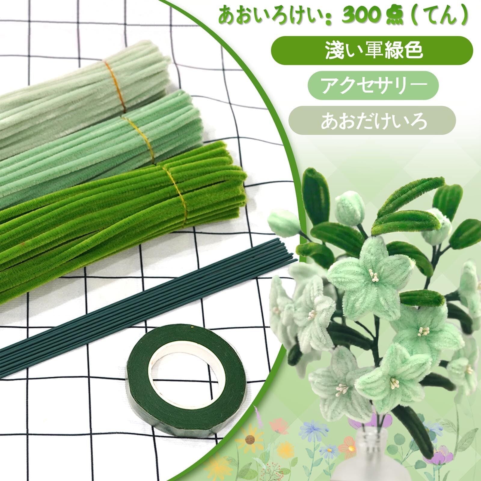 【在庫セール】手芸モール フラワーモール カラーミックス 工作 モール 300本 6mm 花束 モールフラワー キット 人工花茎10本とフラワーテープ 緑1巻と DIY 飾り物 造形材料 学校 手作り素材 手芸 用品 記念日 誕生日 母の日 バレンタインデー 贈り物 (グリーンセット)