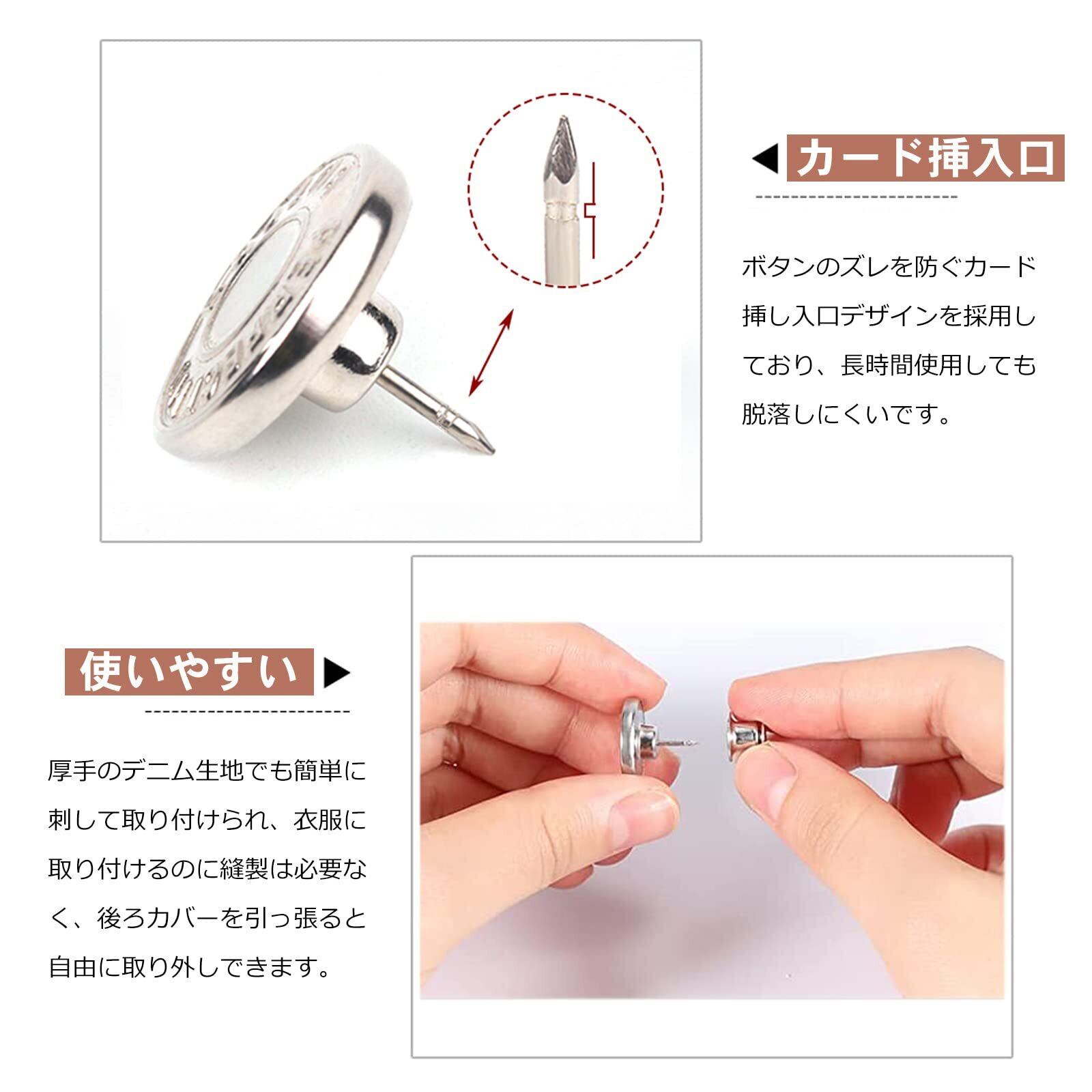 【工具不要、縫いなし、交換簡単】 工具不要、縫製不要、取り付けがとても簡単なので、誰でも使用できます。厚手のデニム生地でも簡単に刺して取り付けられ、衣服に取り付けるのに縫製は必要なく、後ろカバーを引っ張ると自由に取り外しできます。繰り返し使用することができますので、ジーンズのボタンピンを外したいときに、工具不要で簡単に外せ、新しい洋服に再利用できます。