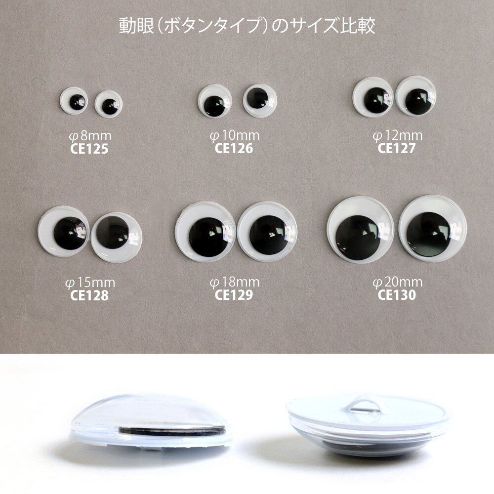 ■サイズ/φ15mm■素材/プラスチック製■ぬいぐるみや編みぐるみに付けるとかわいい目のパーツです。ボタン式なので手縫いで付けられ強度も◎揺らすと黒目がキョロキョロと動きますテディベアなどのぬいぐるみはもちろん、毛糸などで作ったポンポンに目のパーツを付けるだけでキュートなキャラクターが完成します