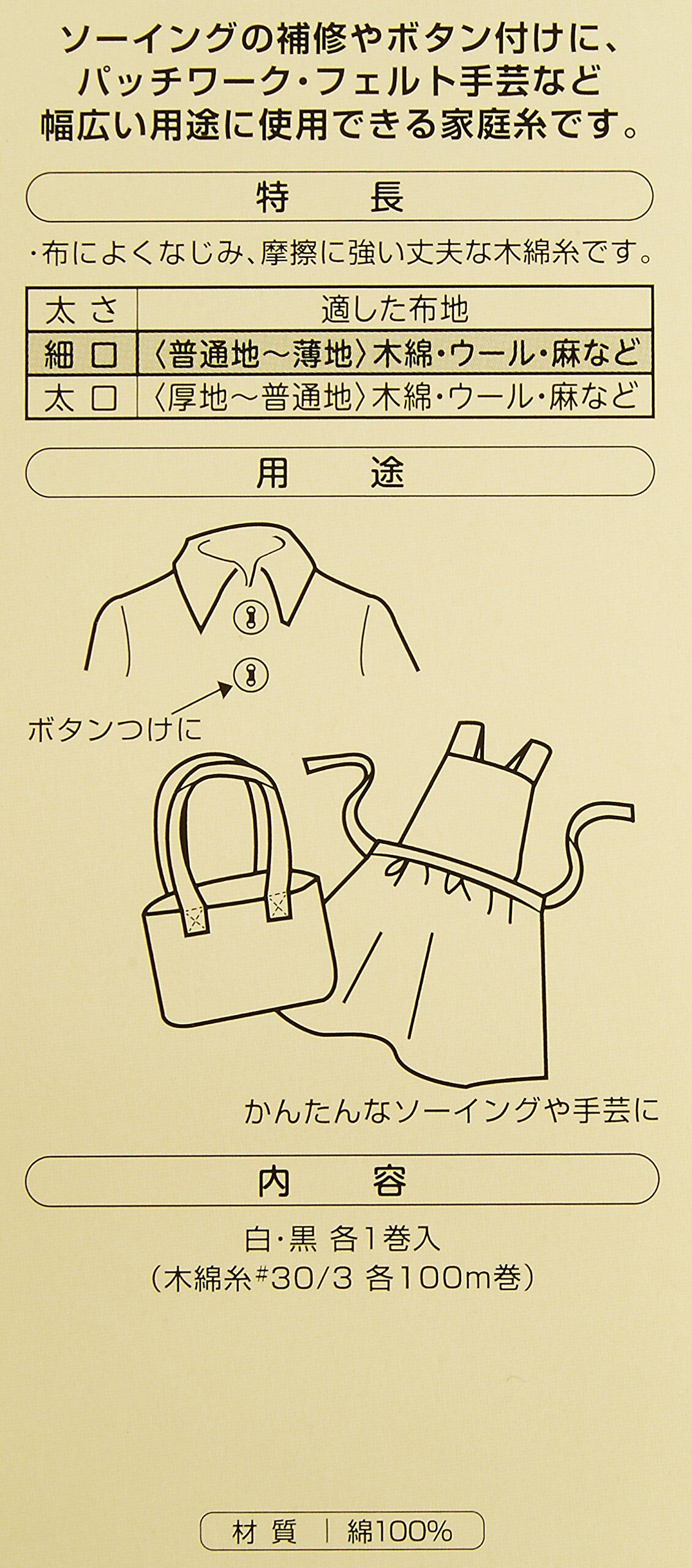 ボタンつけや補修、服づくりなど幅広く使える手ぬい糸です。