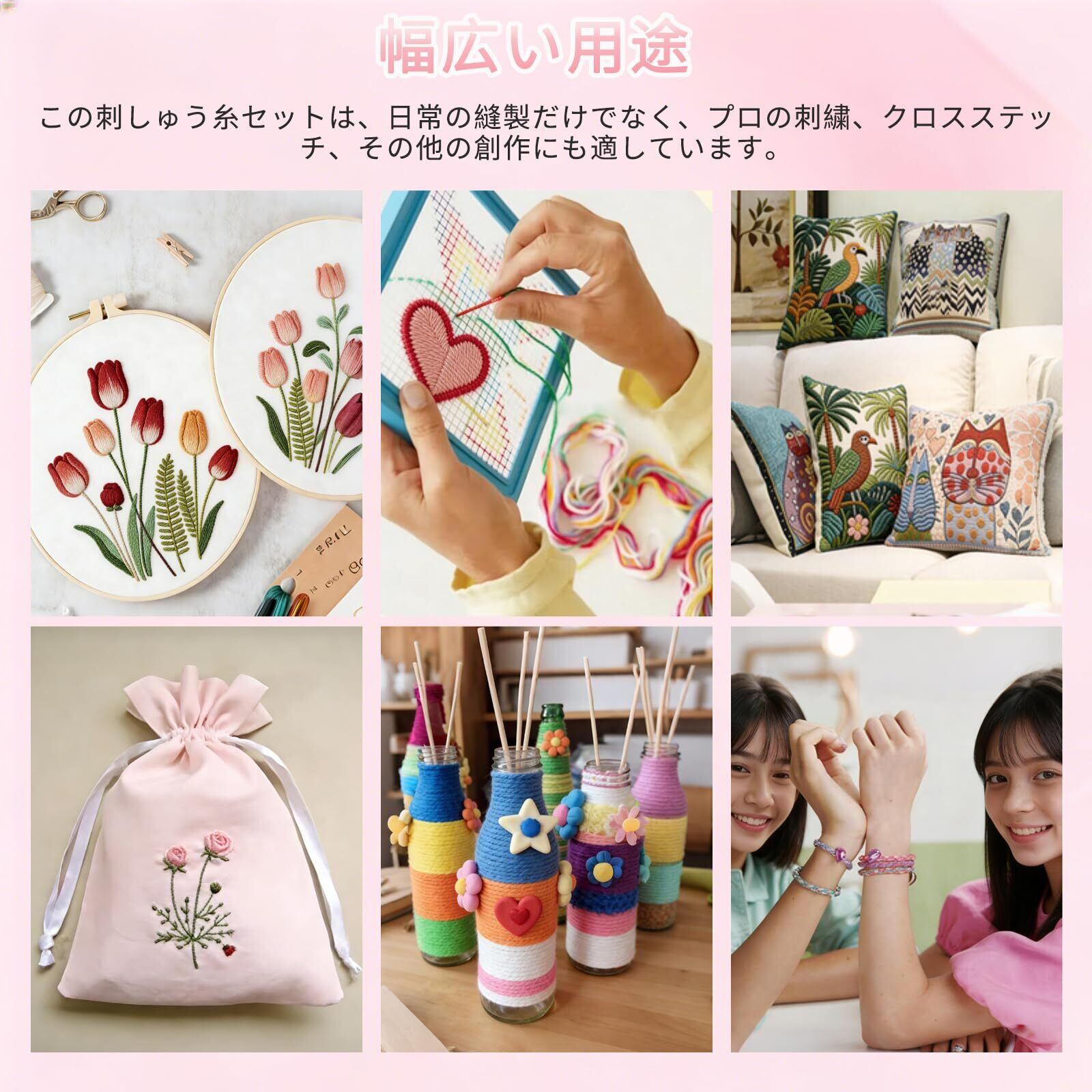 【幅広い用途】:この刺しゅう糸セットは、クロスステッチ、入園のお名前刺繍、洋服のボタン付け、マーク付けなど、様々な用途に活用できます。あらゆるクラフト愛好家やデザイナーにとって必須の製品であり、さまざまなクリエイティブなデザインを簡単に実現できます。