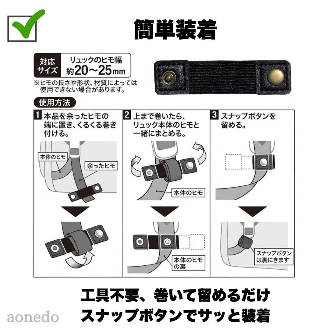 【スッキリ固定】リュックの余ったヒモを切らずにまとめられる固定バンド。ブラブラせず見た目もすっきり。引っかかりを防ぎ、置いたときも邪魔になりません。通勤・通学・旅行やアウトドアでも快適に使えます。【左右ズレ防止】リュックの肩ヒモの長さをしっかり固定。持ち上げた時や使用中に長さが変わるのを防ぎます。左右のバランスが崩れず、調整したベストなフィット感をキープ。毎回の再調整の手間もなく快適です。【簡単装着】リュックの余った肩ヒモをくるくる巻いて、スナップボタンでパチッと留めるだけ。工具不要で誰でも簡単に取り付けできます。