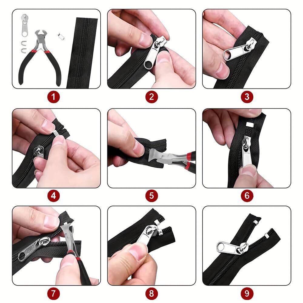 【専用プライヤーによる簡単で確実な取り付け】 セットには、ストッパーの取り付け作業を容易にする専用のファスナープライヤー(約10.5 x 7 cm)が付属します。この工具は各種サイズのストッパーに対応しており、コツを必要とする細かい作業をサポートします。付属の取り扱い説明書と併せてご利用いただくことで、DIYが初めての方でも比較的スムーズに作業を進められるよう配慮されています。