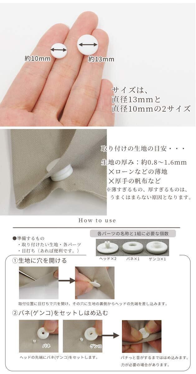 商品仕様 ・生地の厚みによっては取り付けができない場合もございます。予め、生地の厚みをお確かめの上、お使いください。 ・薄地の場合は、別売りのパッキンをご使用ください。 ・一度、取り付けますと取り外しは不可能です