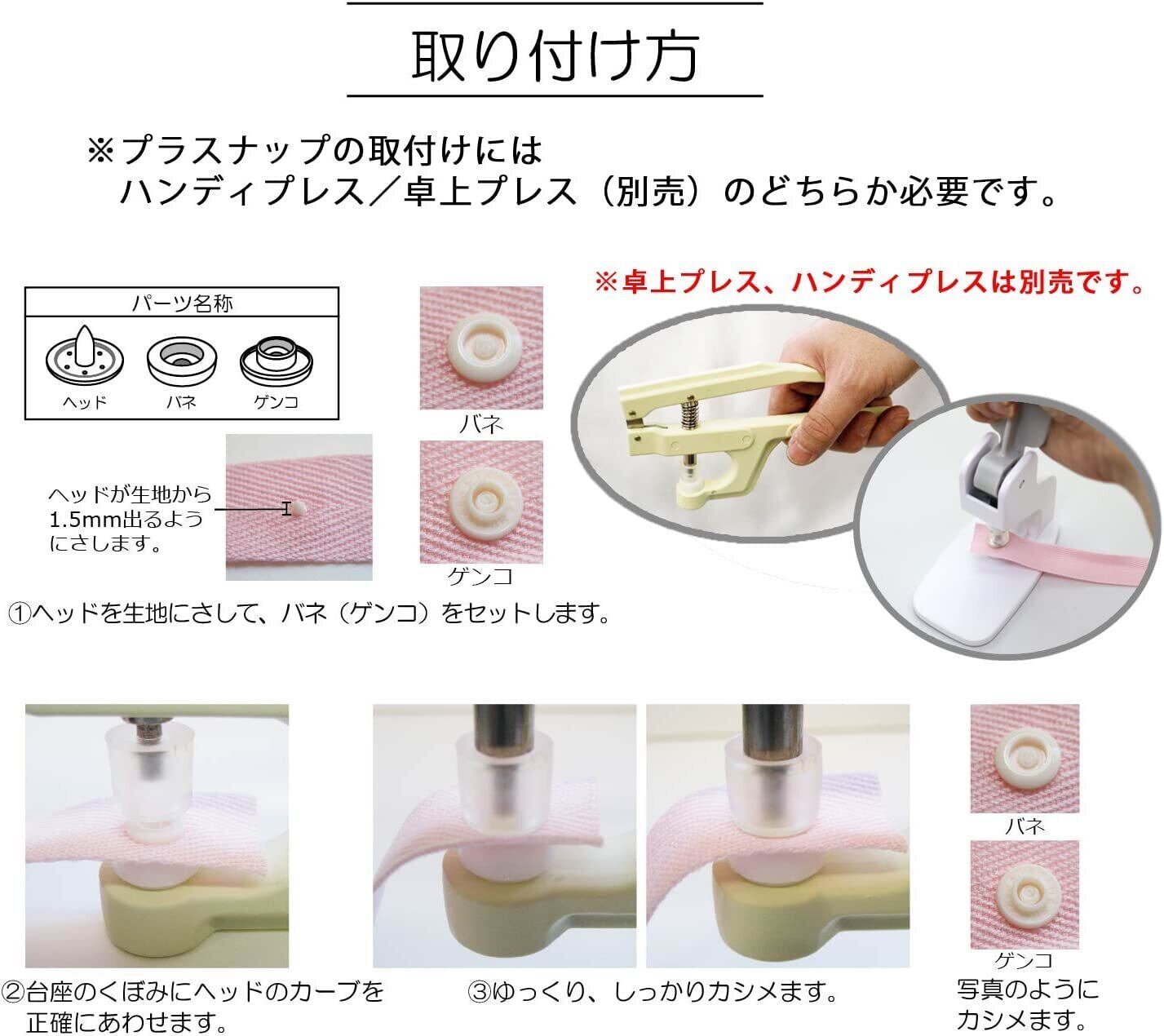 ・ボタン用台座(品番:SUN15-80)はセットされておりません。プラスナップボタン取付に別途ご購入して頂く必要のある台座です。