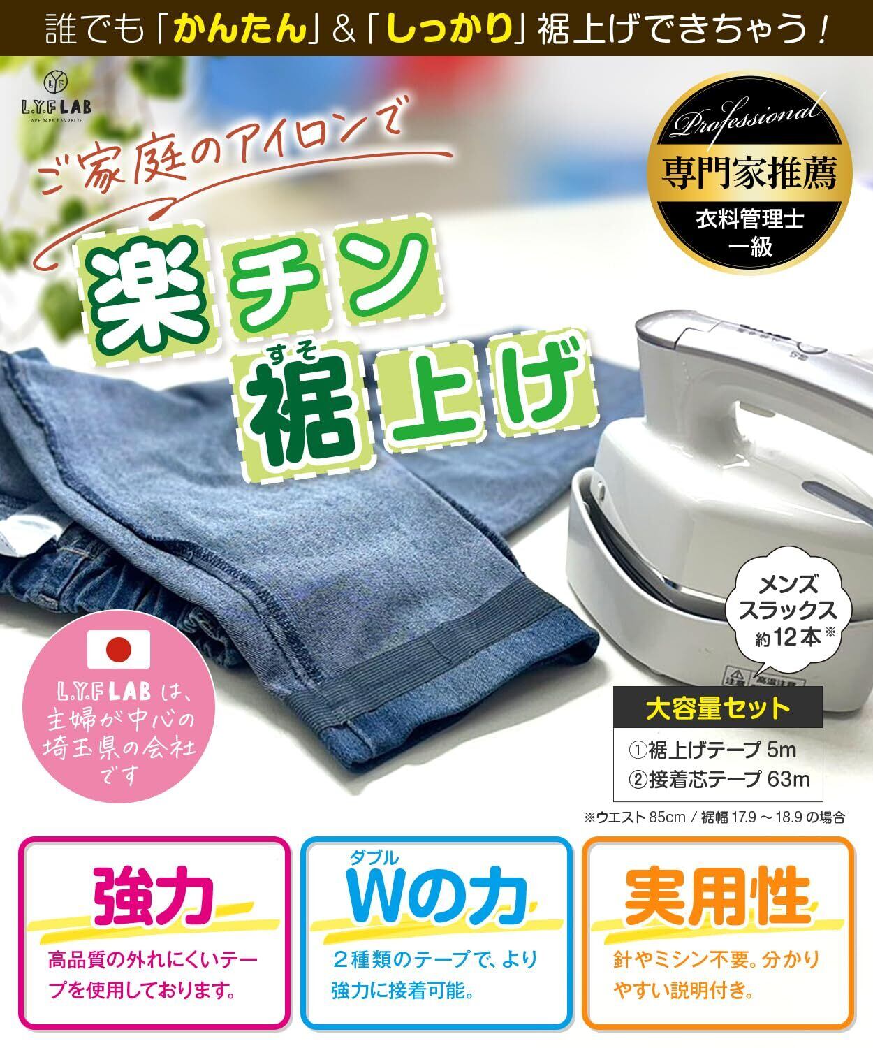 【 初心者でも安心!どなたでも使える「楽チン裾上げ名人」! 】 当商品はズボンやスカート、カーテンの裾上げなどに便利な「裾上げテープ」と「接着芯テープ」がセットとなった商品です。ミシンや糸はご不用、ご家庭のアイロンで、簡単にしっかりと接着が可能となっております。
