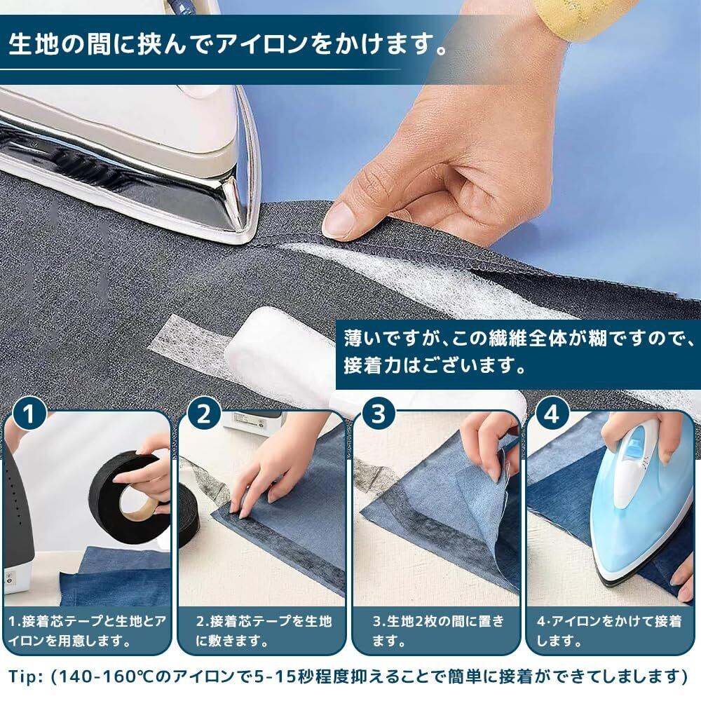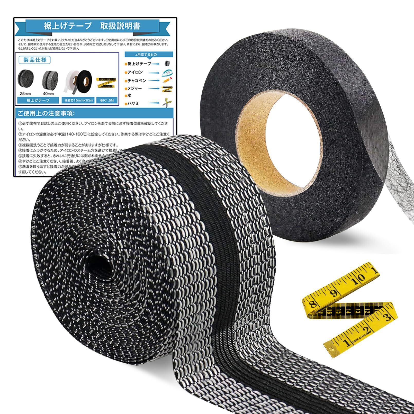 【内容量と製品仕様】 裾上げテープ4cm(新幅)×5M(長さ)*1本、黒の接着芯テープ15mm×63m*1本、両面用のメテープメジャー*1本、詳しい日本語取扱説明書*1本。