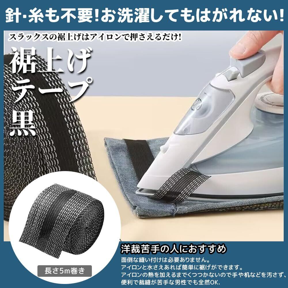 【在庫セール】裾上げテープすそあげテープ アイロン 強力 裾直しテープ ズボンの裾上げ アイロン接着テープ 裾上げ ズボン裾上げテープ 布用 アイロン接着 ストレッチ ズボン スカート 裁縫上手 水洗い可能 (ブラック接着テープ, 5M)