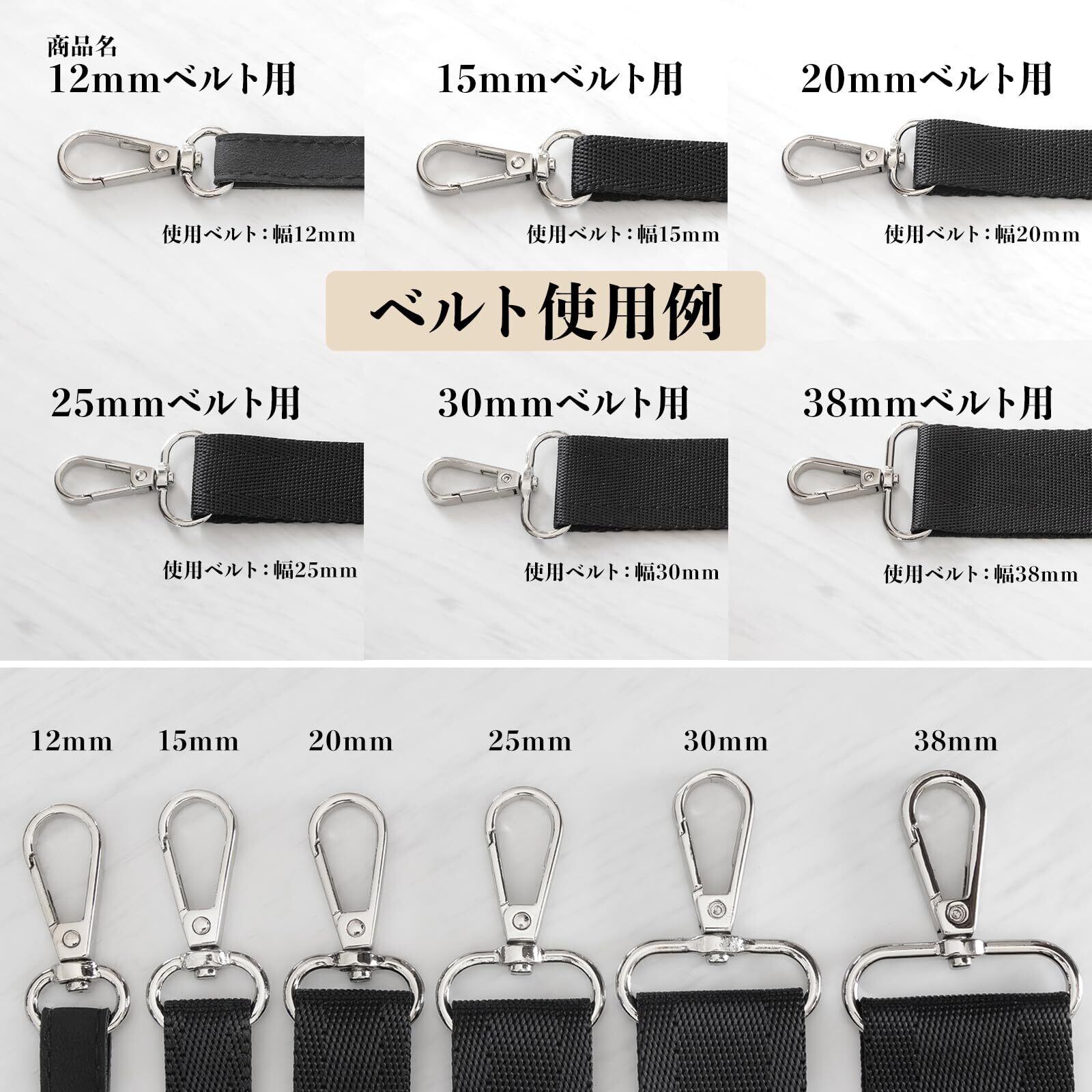 【選べるサイズ展開】12mm・15mm・20mm・25mm・30mm・38mmベルト用の全6サイズをご用意。用途やバッグのベルト幅に合わせて最適なサイズをお選びいただけます。