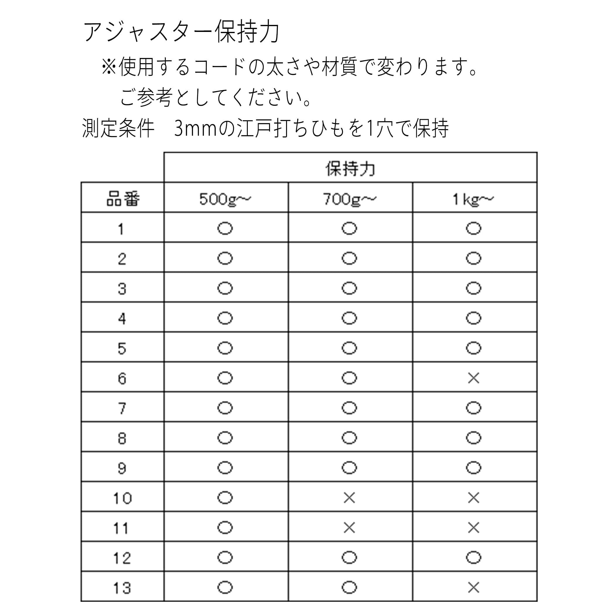 樹脂製、スプリング式です。紐の太さ・摩擦に左右されますが、穴1つ通しで1000gの静荷重に耐えられます。