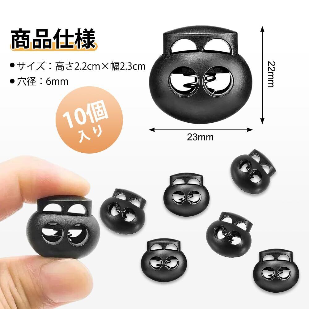 軽量で丈夫な2つ穴コードストッパー10個セット。高さ2.2cm×幅2.3cm、穴径6mmでリュック、バッグ、衣類、帽子などの紐調整に最適。スプリング構造で紐を簡単に固定でき、持ち運びや収納も便利です。