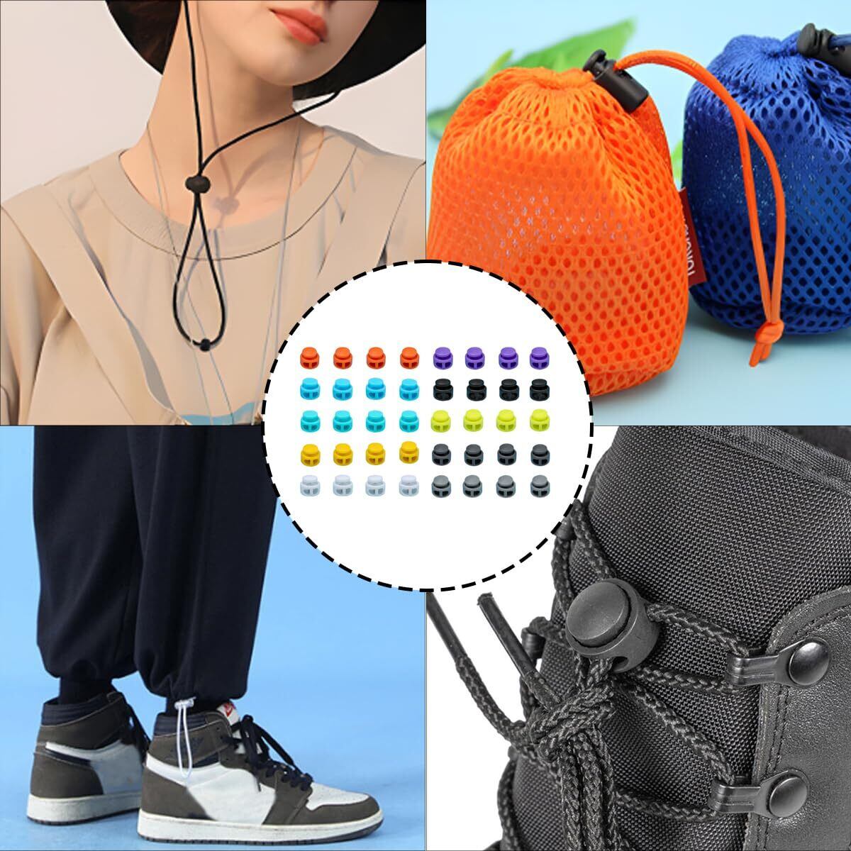[幅広い用途]紐止め、ボトルカバーの口の部分、ウエストゴムの紐止め、リュックのストッパー、帽子のひもの留め具、巾着袋の開閉補助具など色々使えます。アウトドア場合にも大活躍、テントやリュックサックの括り、スパッツのゴムの予備にと用途が広い。また靴紐、ランヤード、荷物、バックパック など幅広く活用できます。