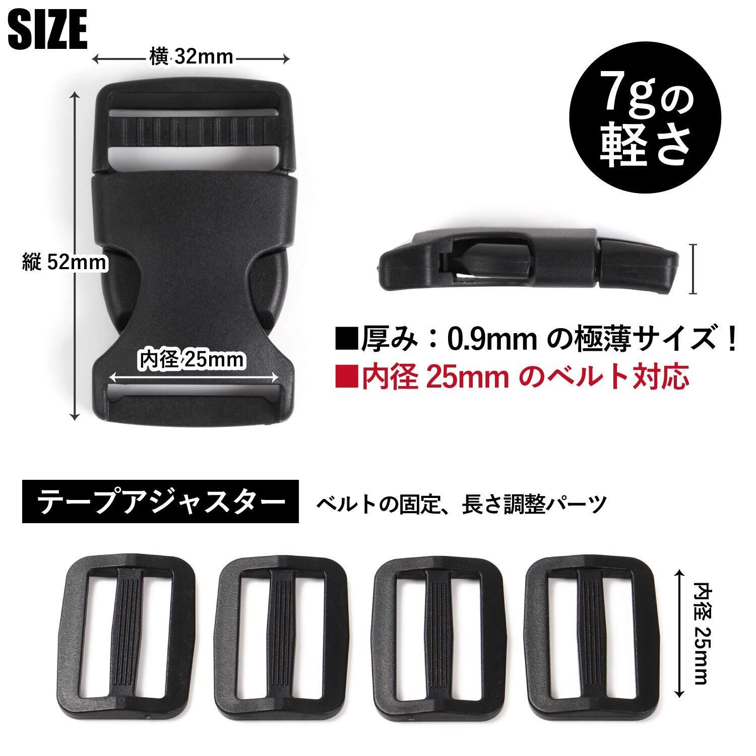 【タイプ】 片側に長さ調整機能を備えたバックル(片引き) 【 バックル 2個入・テープアジャスター 4個入 】