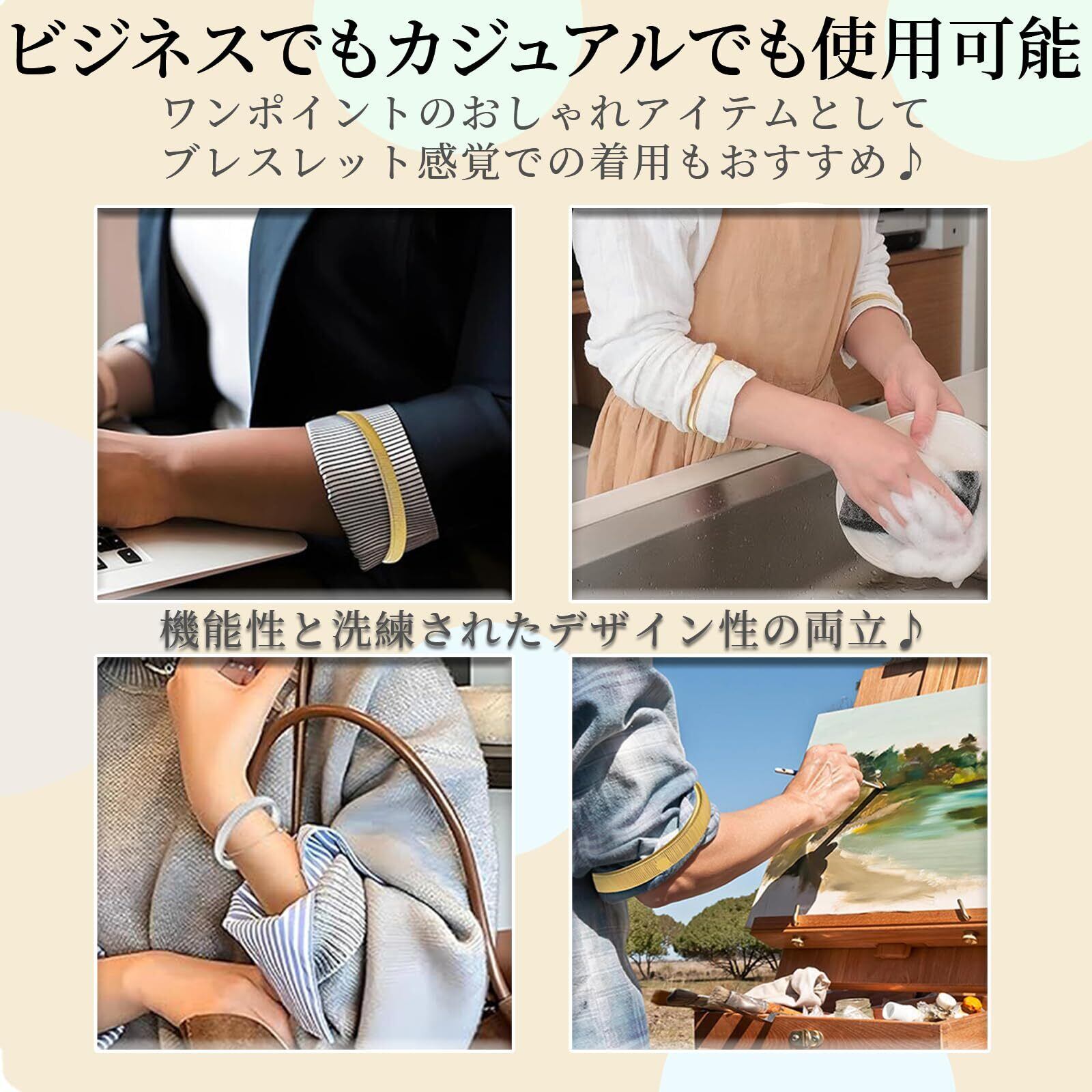 【スプリングアームバンドは使い方色々】家事や作業はもちろん、スポーツやアウトドア、ビジネスシーンまで多様な場面で活躍。まくった袖の固定や、袖丈の調整に便利です。コンパクトで持ち運びにも便利です。