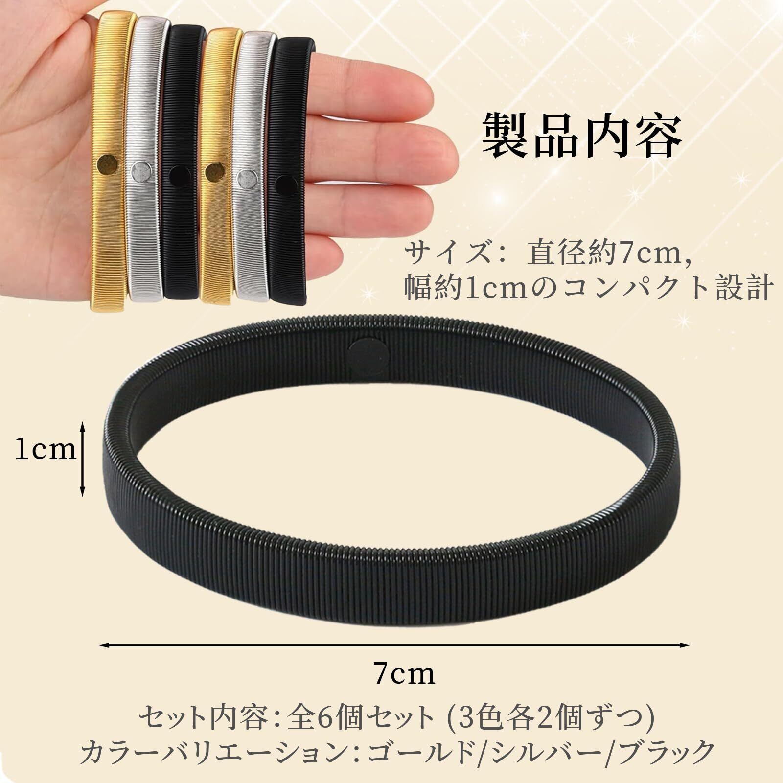 【製品情報】ゴールド、シルバー、ブラックの3色を各2個ずつ、合計6個のセットです。直径約7cm、幅約1cmのコンパクトサイズで、1個あたりの重さは約20gと軽量。コストパフォーマンスに優れた大満足のセットです。