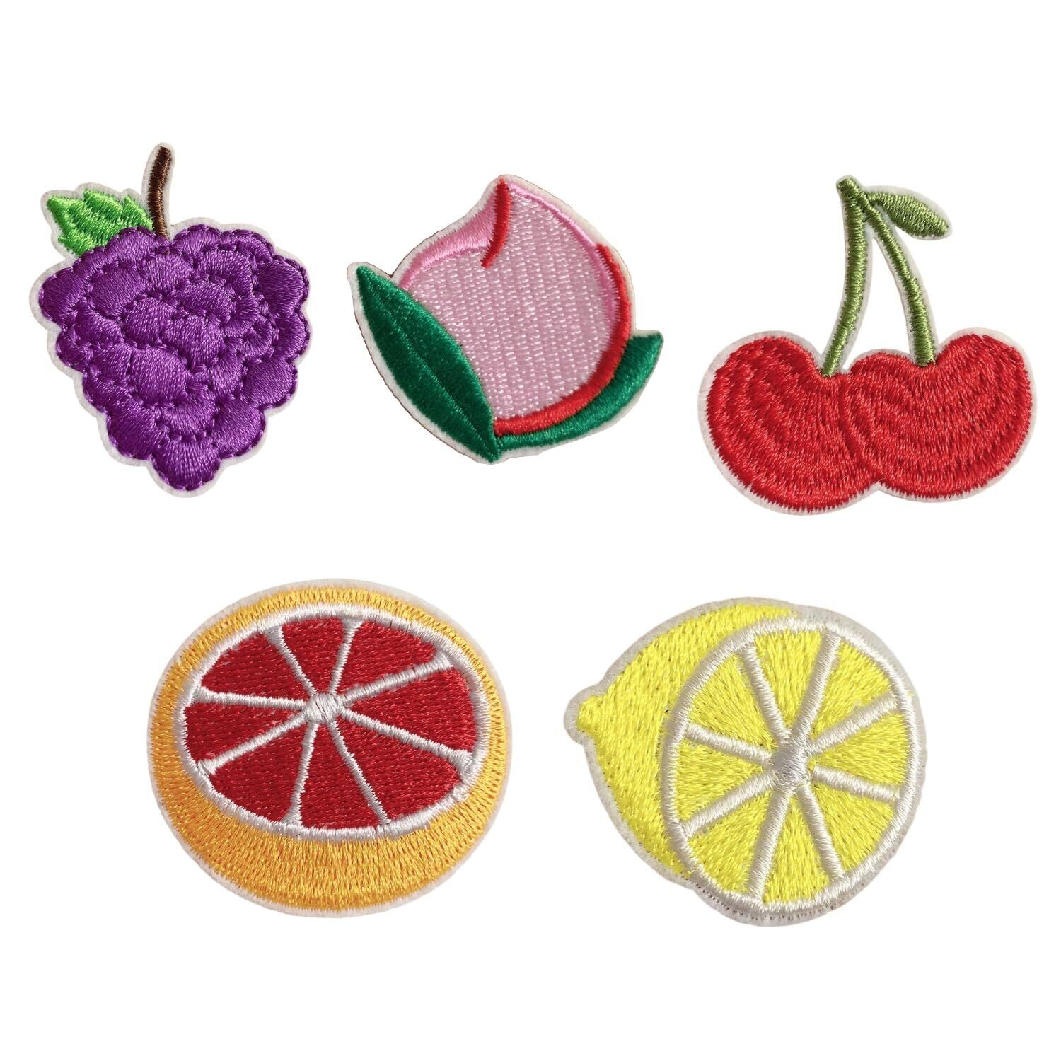 【サイズ・バリエーション】小さめサイズのフルーツ刺繍ワッペン5枚セットです。ぶどう、桃、サクランボ、グレープフルーツ、レモン、パイナップル、オレンジ、スイカ、バナナ、リンゴ、ブルーベリーなどのカラフルなデザインで、子ども服や小物にぴったりです。