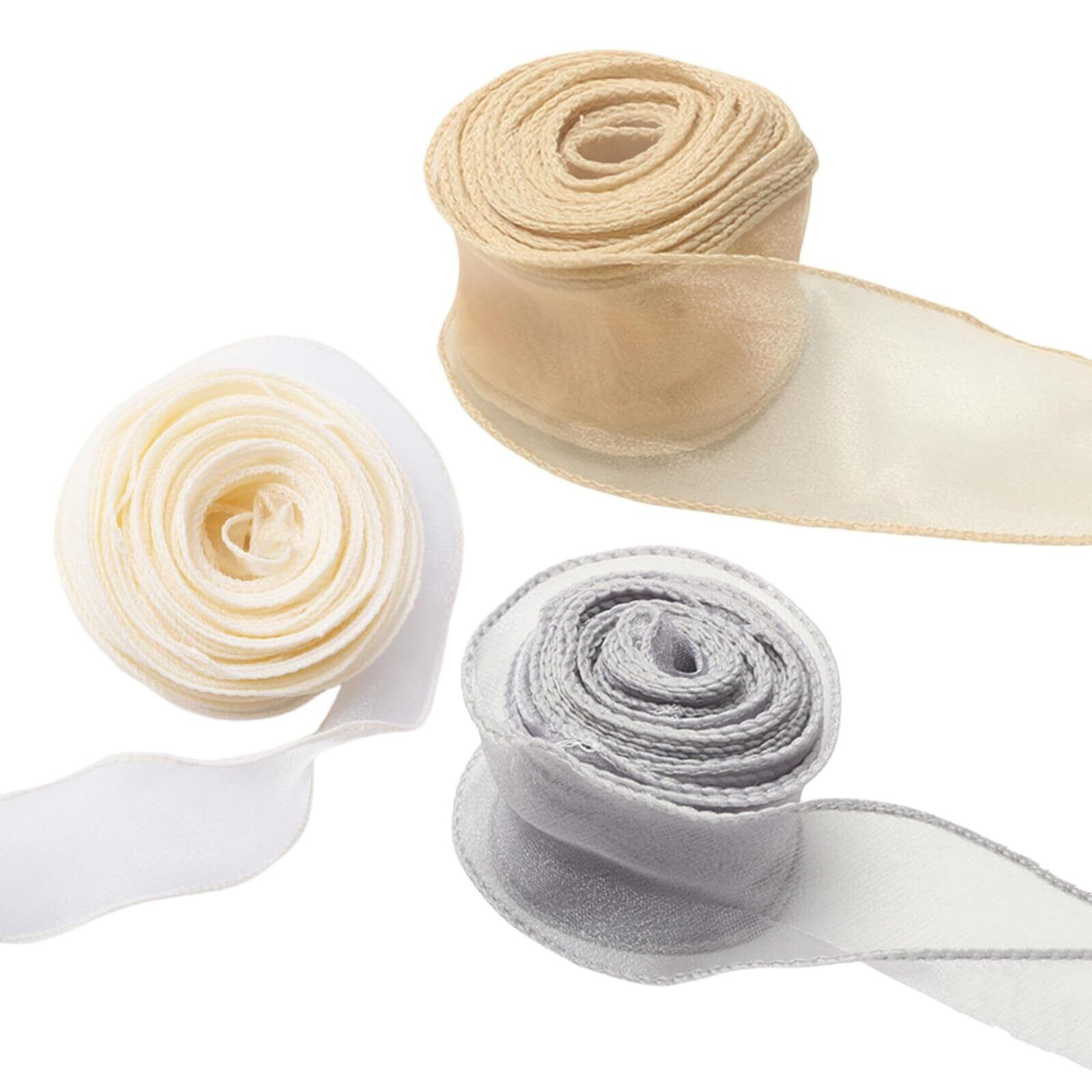 YFFSFDC オーガンジーリボン 長さ約9m 幅 4cmリボン 飾り 手芸 ラッピング バレンタイン 無地 ギフトラッピング DIY 花束弓,結婚式パーティーの装飾 ヘアアクセサリー3巻入 (グレー+ゴールド+ベージュ)