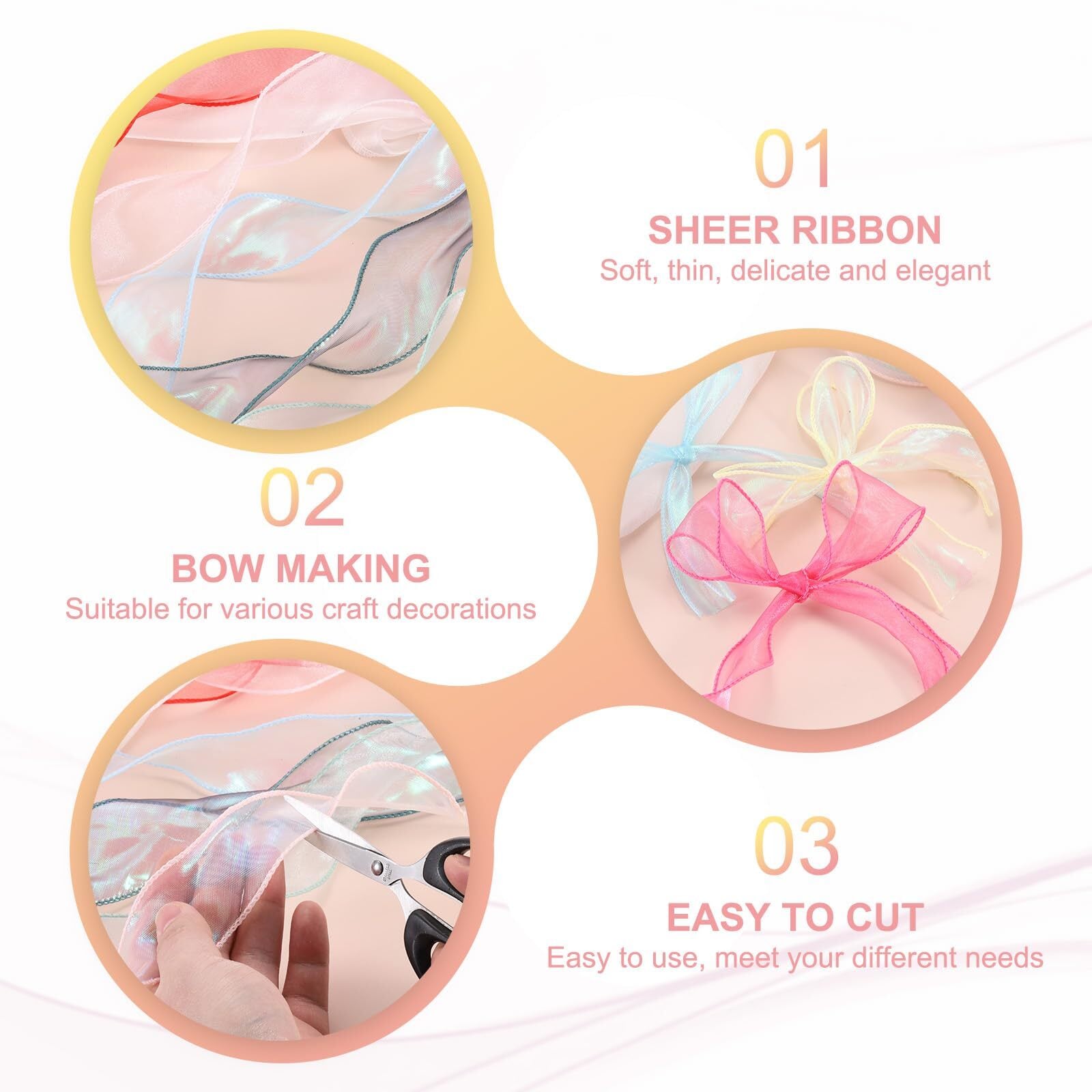 シアーオーガンジーリボンは柔らかく、薄く、透明で、美しい視覚的なインパクトを作り出し、プロジェクトに優雅と洗練された雰囲気を加えます。さまざまな祭りやパーティーデコレーションに適しています。