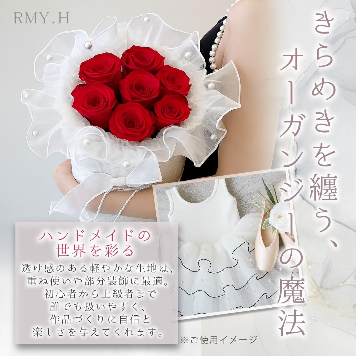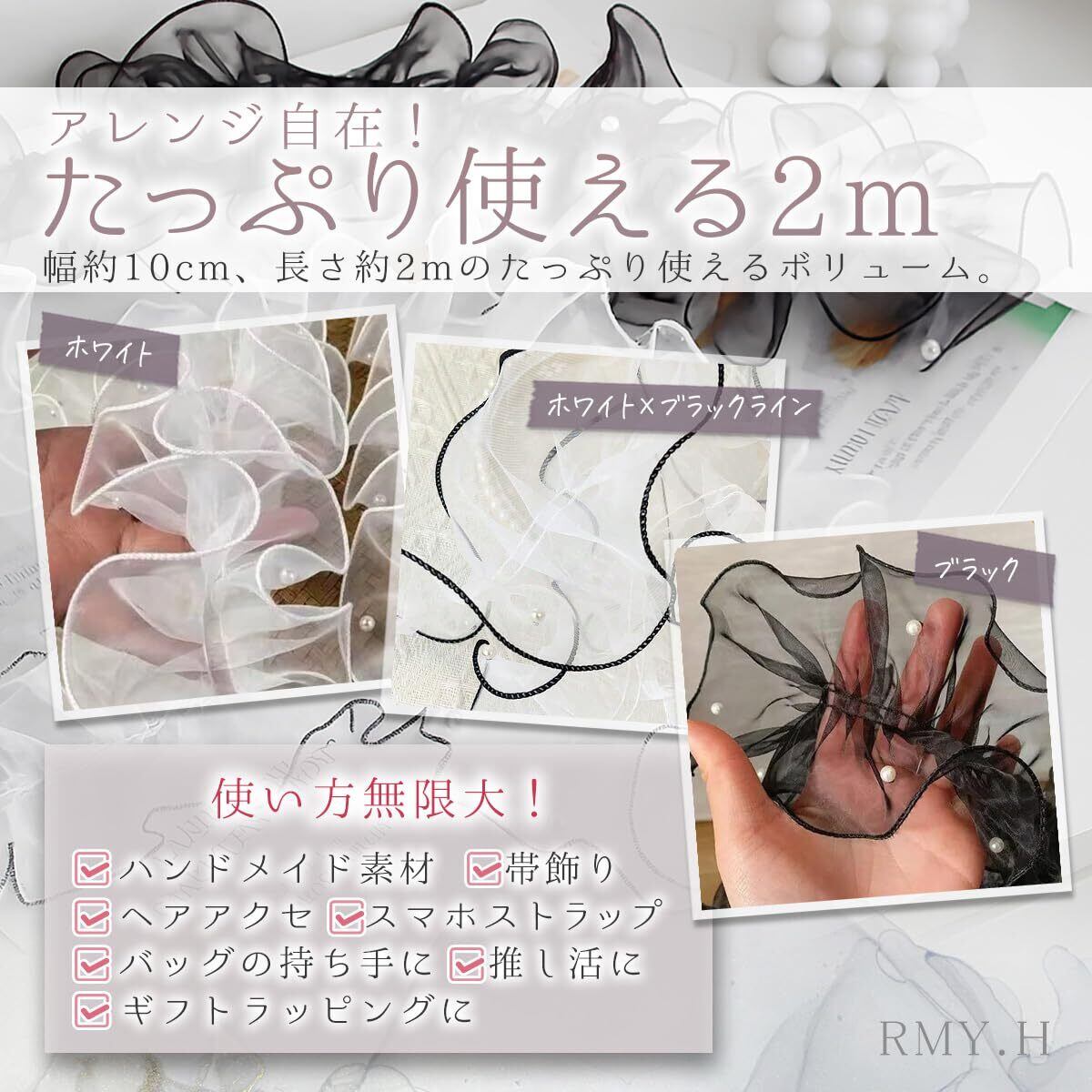 RMY.Hのオーガンジーリボンは、幅11cm×長さ200cmの単品販売。カラーはブラック、ホワイト、ミックスからお選びいただけます。透け感のある軽やかな質感で、髪飾りや帯飾り、アクセサリーDIY、コスプレ衣装、結婚式やイベントの装飾に最適。ハンドメイド初心者でも扱いやすく、切って結ぶだけで華やかな作品が完成します。成人式や卒業式など大切なイベントを、自分らしいオリジナルデザインで彩りたい方におすすめのリボン素材です。 裁縫不要で切る・結ぶだけ。初心者でも手軽にアクセサリーやデコレーションを楽しめます。 結んだ形がしっかりキープされるので、帯リボンや髪飾りにも最適。 クラフト愛好家に向け、使いやすく丁寧に仕上げたリボンをお届けします。 【切りっぱなしでのお届け】 本商品は布端を処理していない「切りっぱなし」の状態でお届けいたします。裁ち端にはほつれが生じる場合がございますので、あらかじめご了承ください。