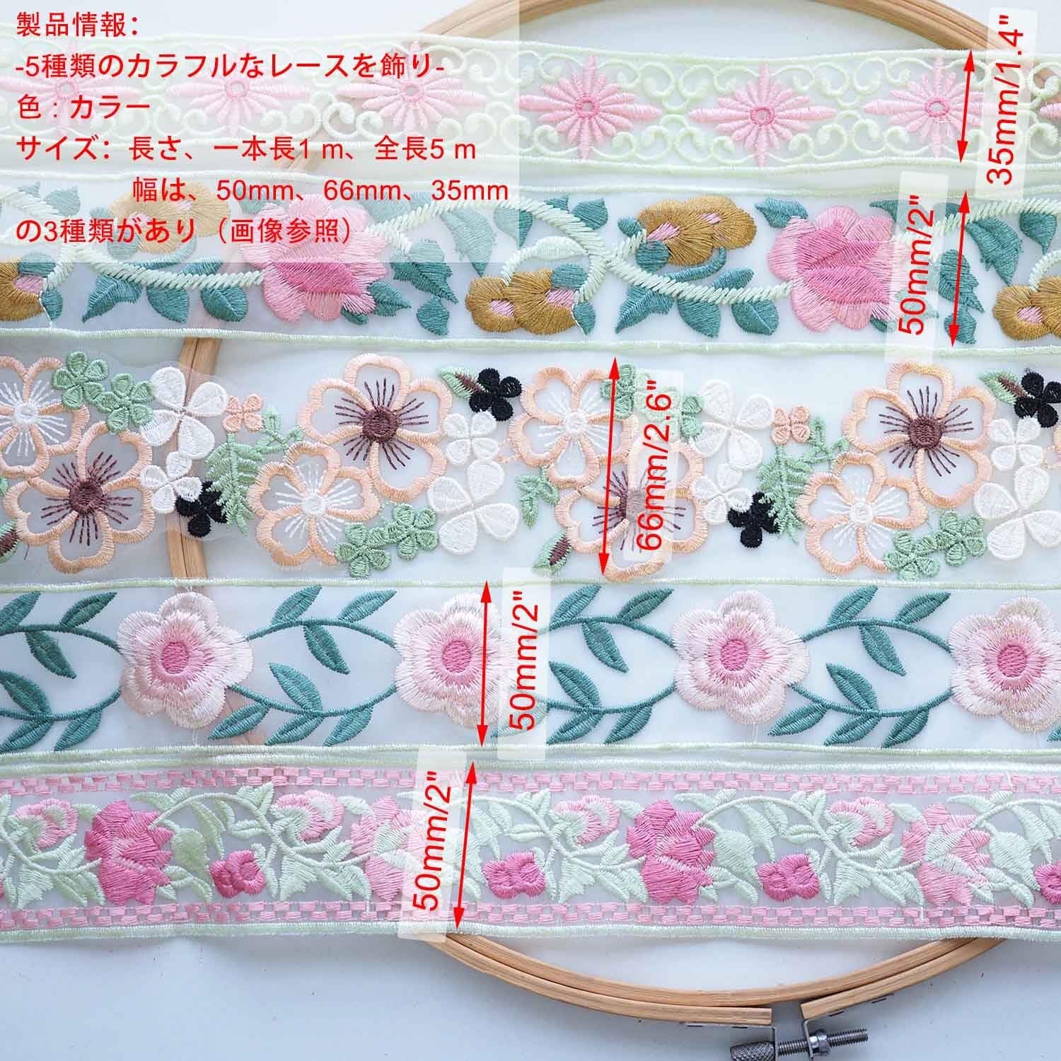 5種類(5m /1 m毎巻) のカラーフラワー装飾レース生地刺繍 DIYハンドメイド、祝いのギフト装飾、裁縫材料、インテリア装飾に使用(カラーミックス)