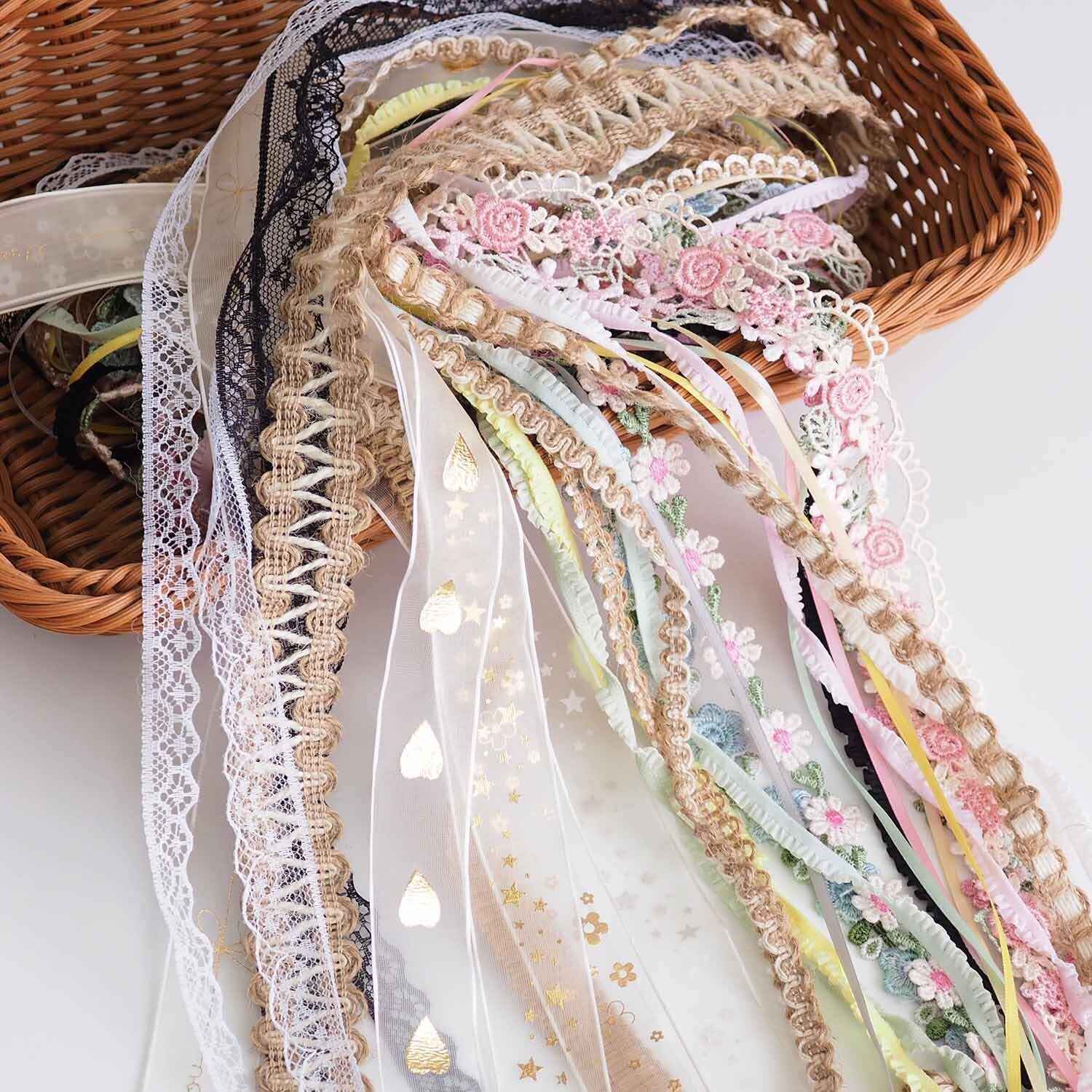 【カラフル&ヴィンテージデザイン】: 華やかな花柄、キュートな星柄、繊細な刺繍入りレースなど、カラフルな色使いとレトロ感のあるリボンが作品をワンランクアップさせます。