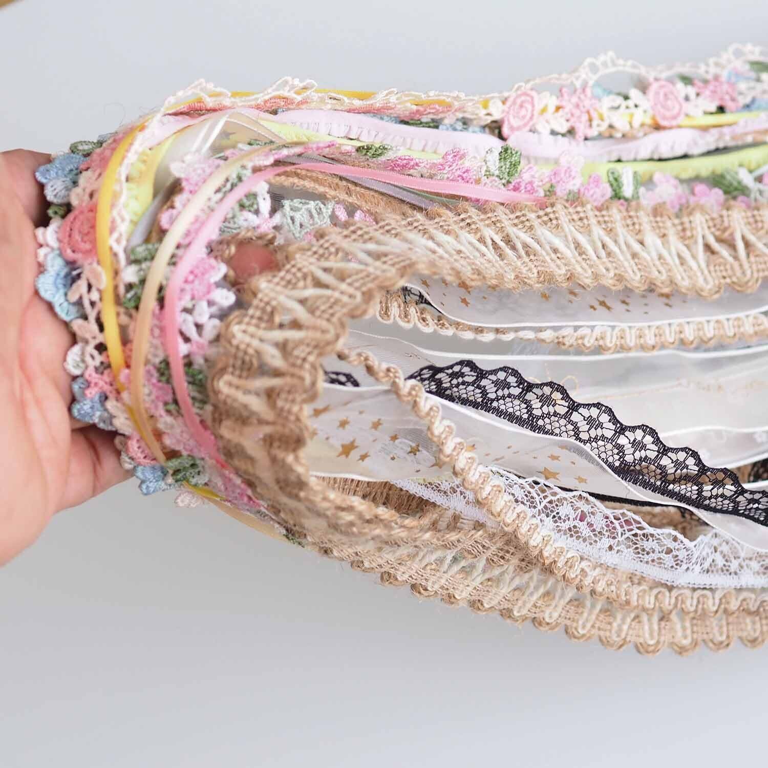 カラフルレース&ヴィンテージ風リボン混装セットは、全30ヤード・30種類のデザインを詰め合わせたクラフト素材です。花柄、星柄、繊細な刺繍入りなど、個性豊かなレースとレトロ感あふれるリボンがDIYやハンドメイド作品を華やかに彩ります。