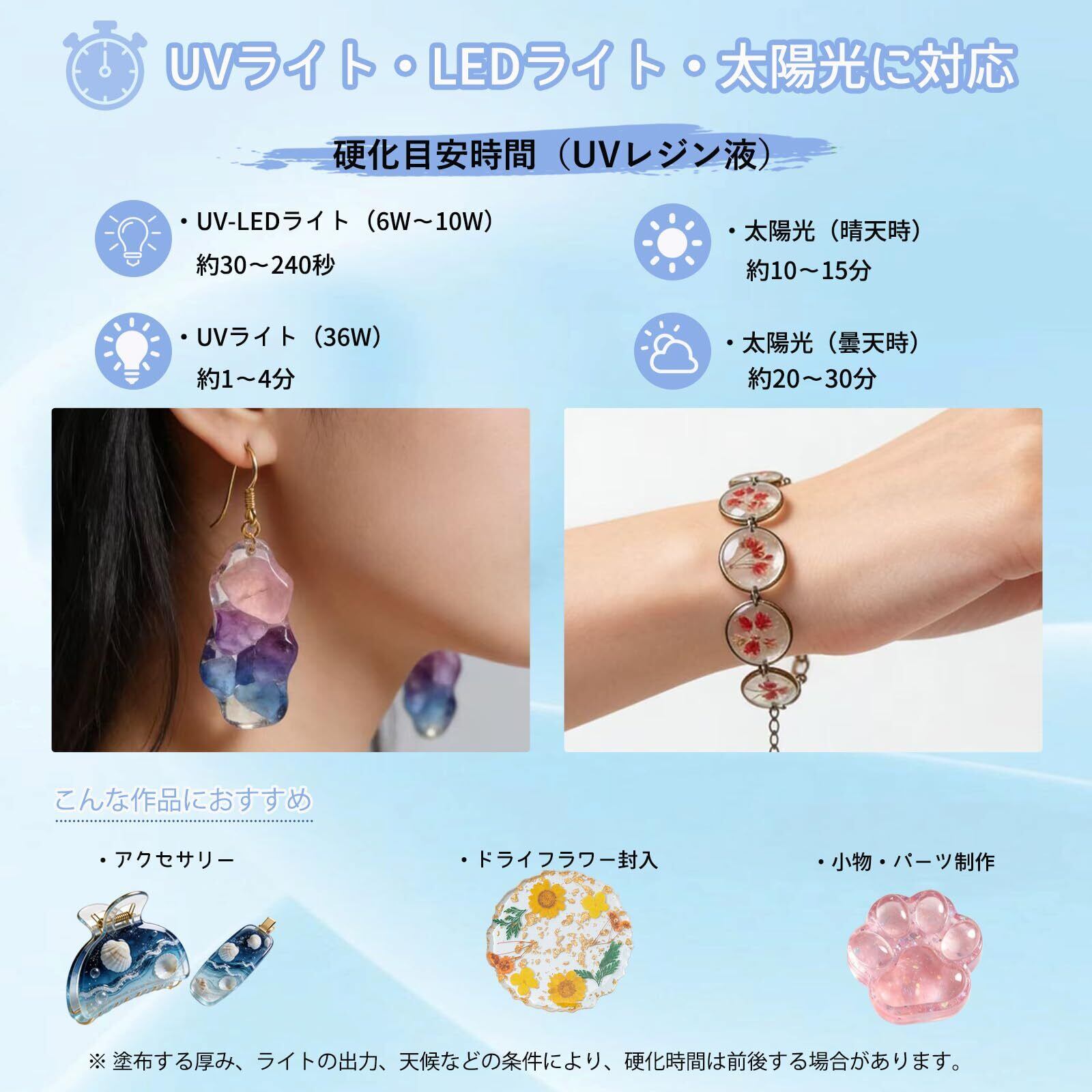 多用途対応・ハンドメイド向け:アクセサリー制作、モールド成形、表面コーティング、クラフト装飾、封入作品など、さまざまなレジンアートに活用できます。完成品はギフトにもおすすめです。