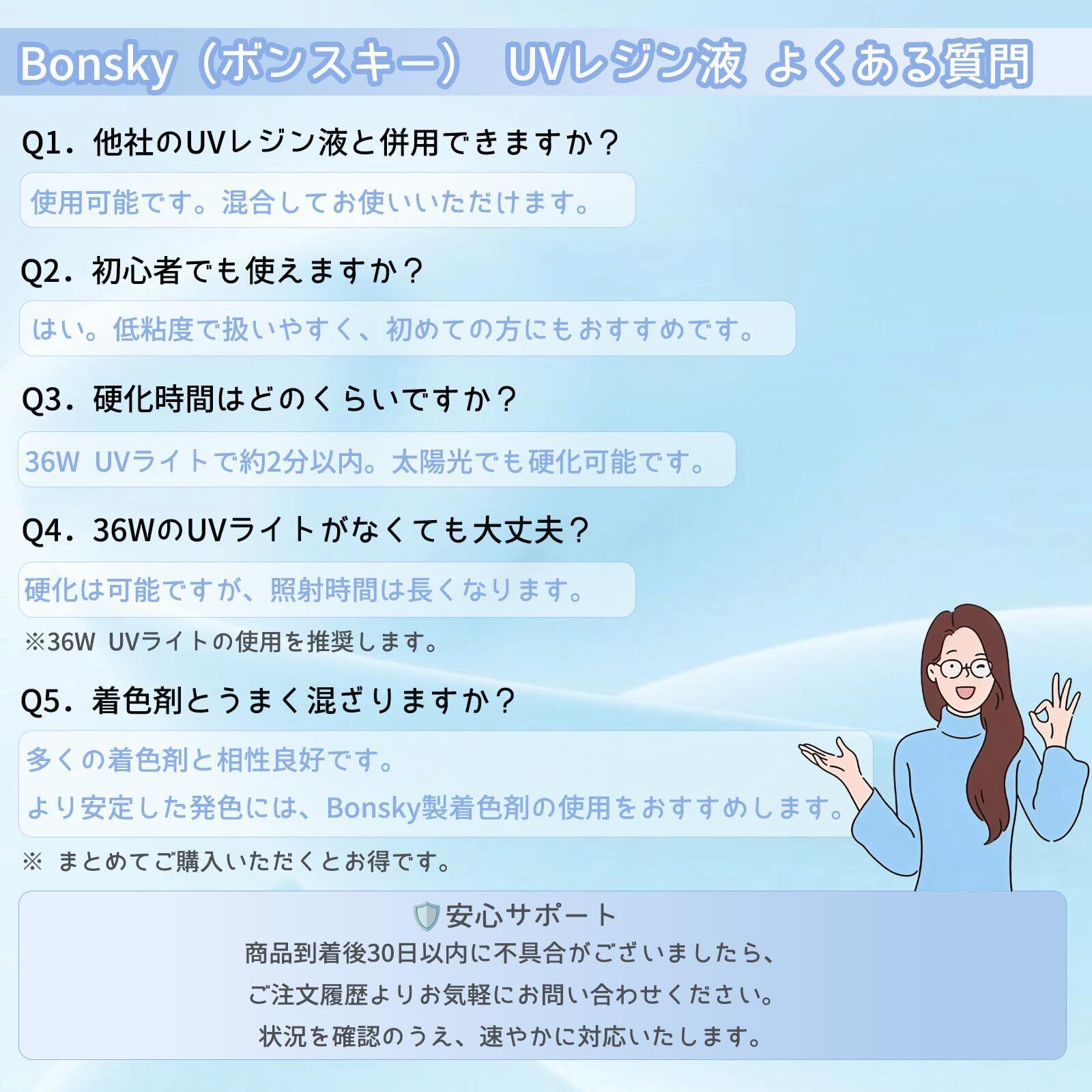 ブランド・内容・アフターサービス:Bonskyとボンスキーはいずれも当社が展開するブランドです。日本向け商品は「ボンスキー」表記となります。【セット内容】UVレジン液125g×2、細口ノズルキャップ×2、アルミ封止オープナー×1。万一の液漏れや欠品はご注文履歴よりご連絡ください。24時間以内対応、1年保証付き。