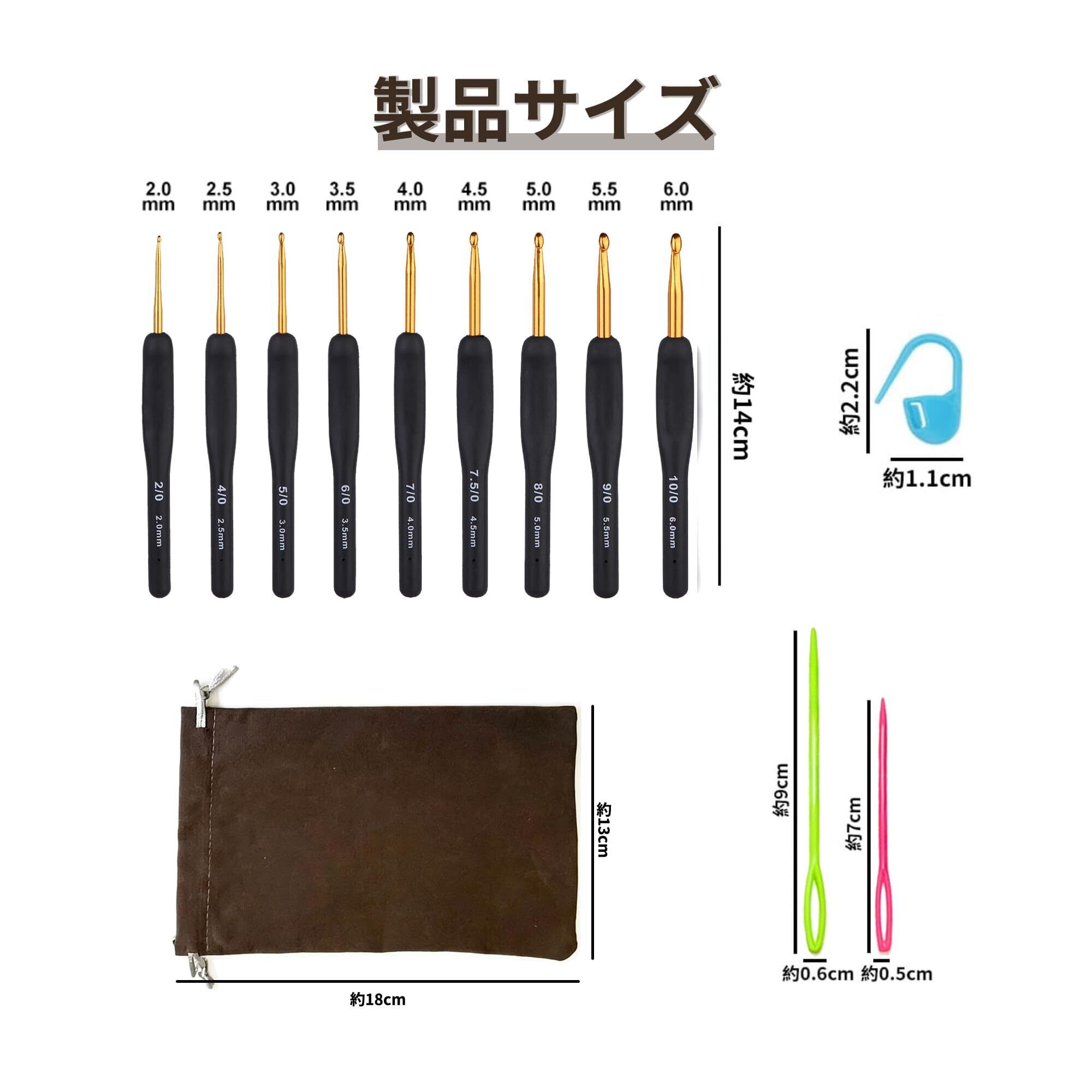 かぎ針 セット 9本 編み物 かぎ針編み キット 初心者向け アルミ製 2.0mm〜6.0mm 収納袋付き マーカー付き Nomli (黒)