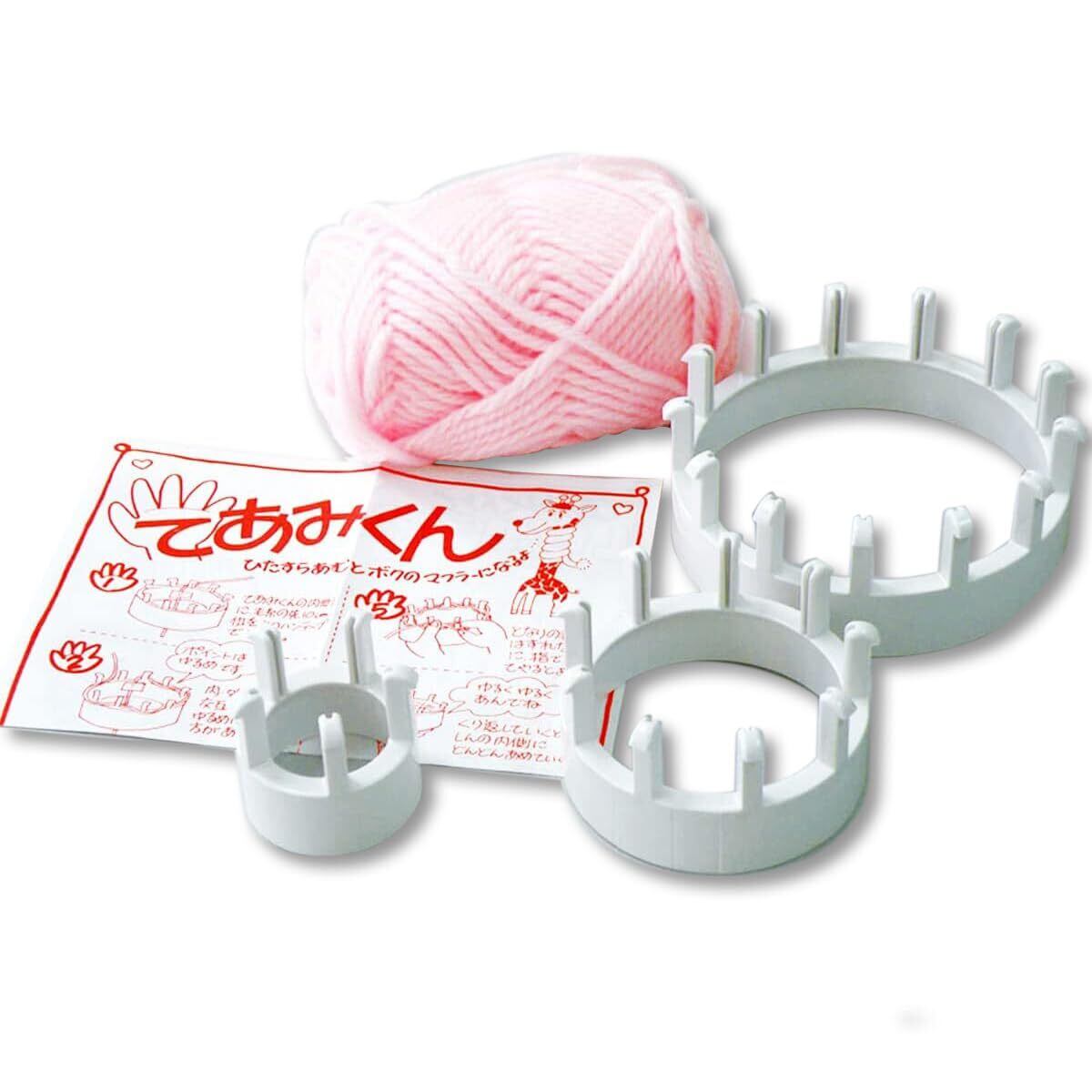お母さんもおばあさんも、なつかしい思い出があるのでは?世代をこえて楽しめるリリアン編みのセットです。例えば手袋を編むとき、胴体の部分は大の枠、親指の部分は小の枠を使用します、3種の編み枠がセットされていますのでバラエティに富んだ作品づくりができます。中サイズの「てあみくん」を使用した場合、毛糸50gで約1m編めます。 毛糸玉はお試し用につき、予告なく色、容量が変更する場合がありますのでご了承下さい。また、本体の色は変更になることがございます。予めご了承下さい。