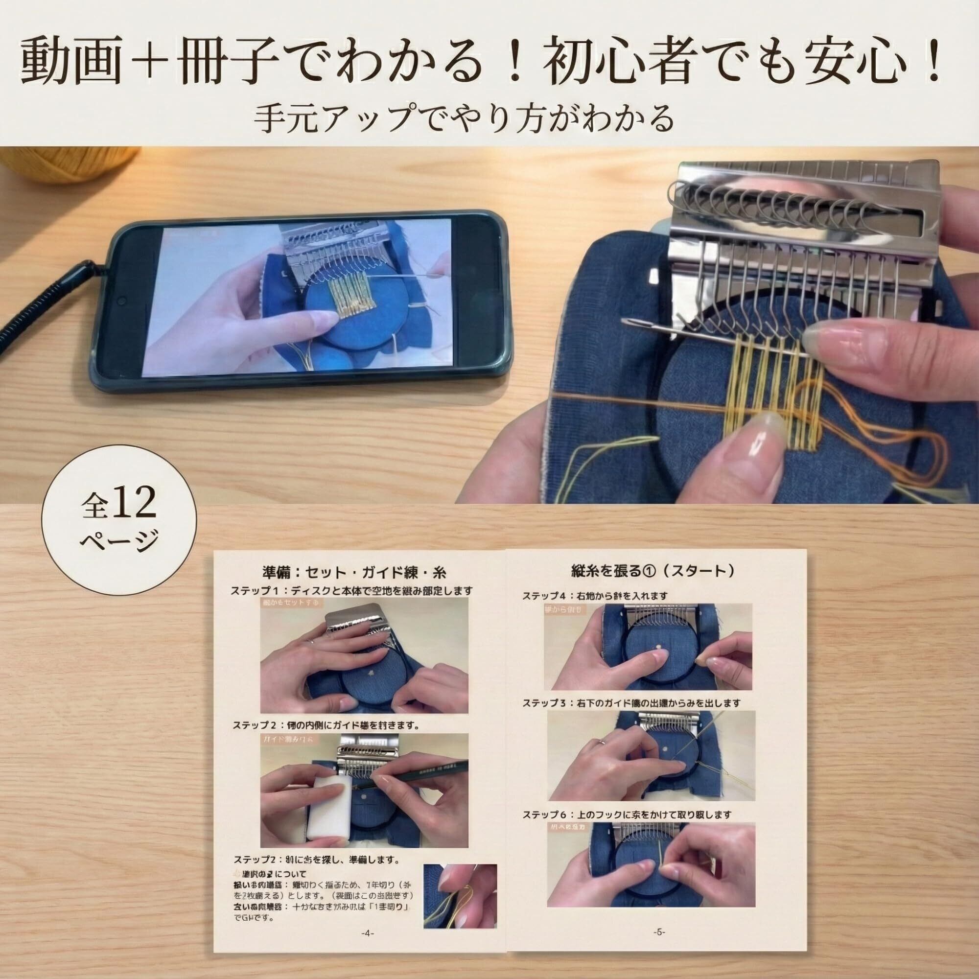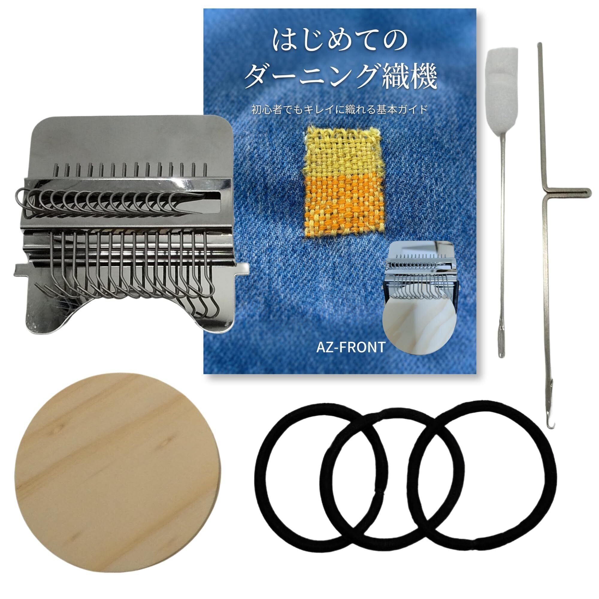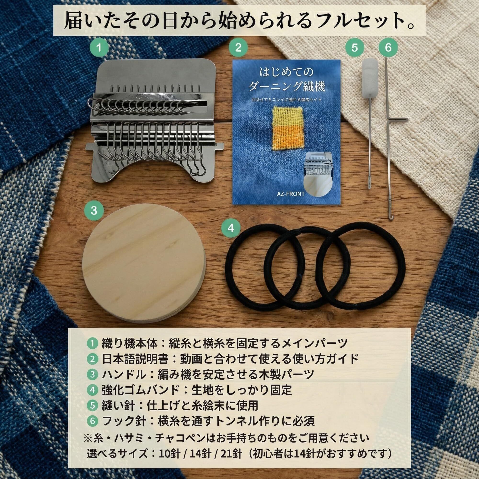 セット内容: 織り機本体、木製ディスク、強化ゴムバンド 3本(予備含む)、フック針(長い針)、縫い針(短い針)、日本語ガイドブック(全12ページ・フルカラー)、実演動画アクセスQRコード