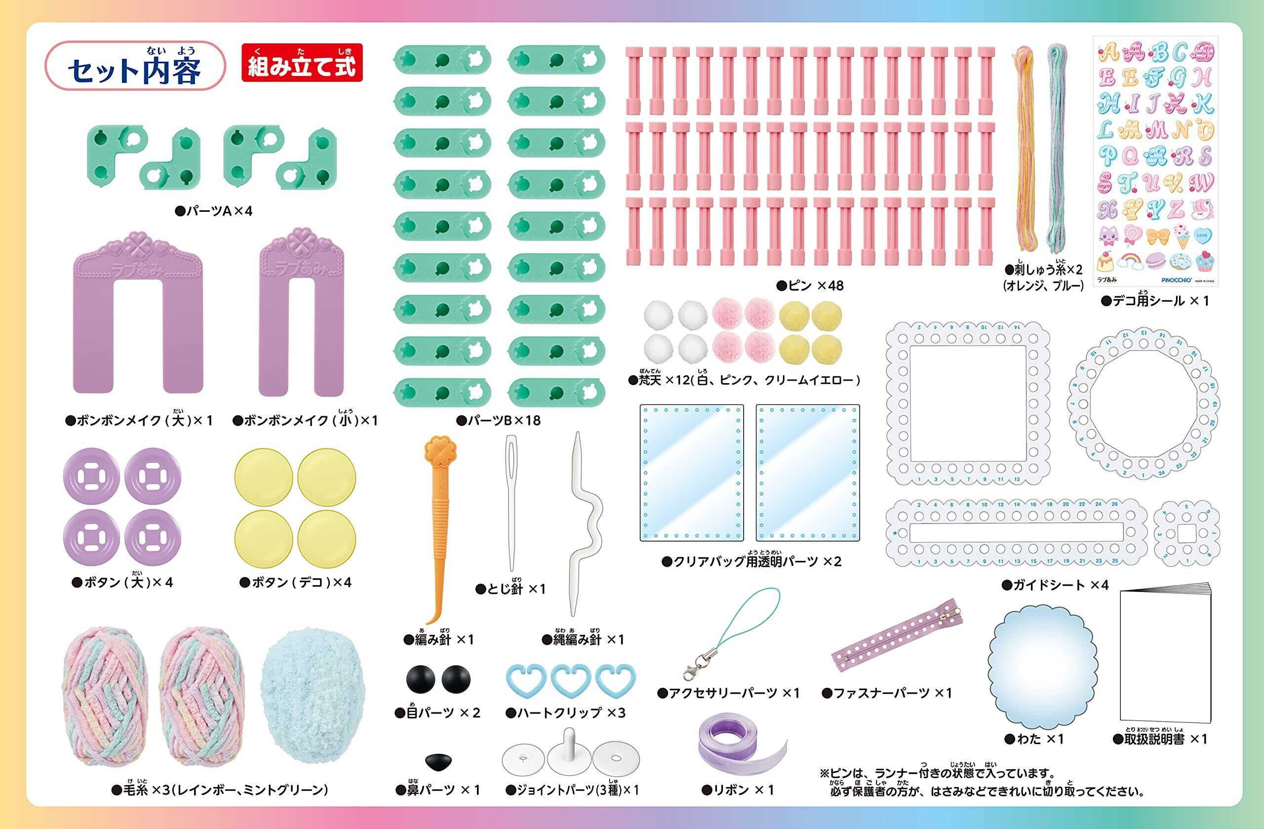 トレンドのクリア素材を用いたニットバッグや、ファスナー付きポーチなどが作れるアレンジパーツがいっぱい入っています。