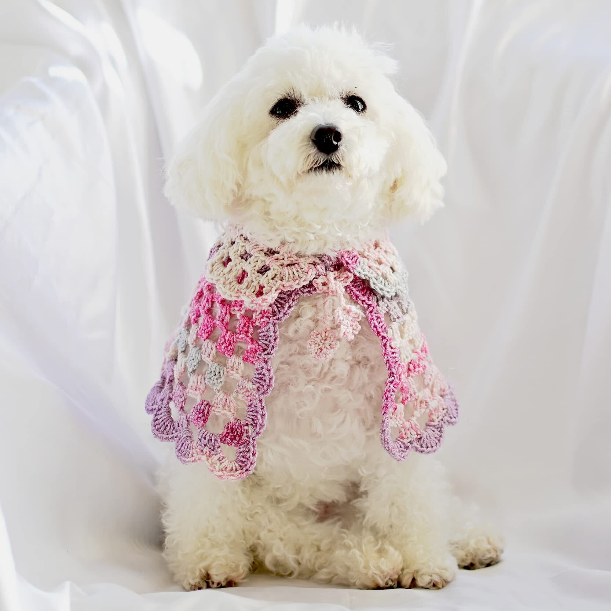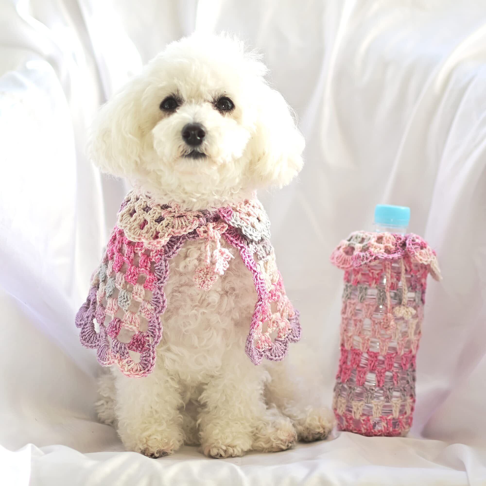 3~4kg 程度の小型動物向けの手編みケープキットです。美しい段染めと、さりげないラメがかわいい作品です。
