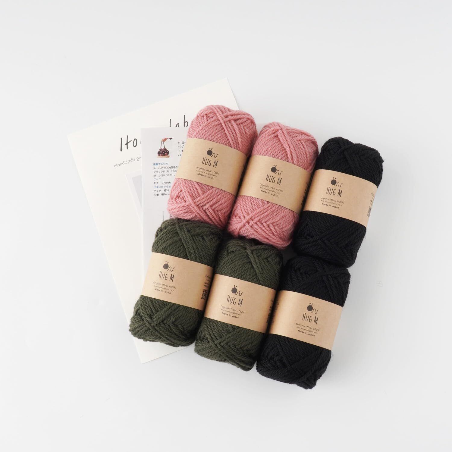 キット内容:糸(1.カーキ):ハグM(30g玉巻き)/ブラック(114)…2玉、カーキ(112)…2玉、ピンク(109)…2玉 レシピ…1枚(※基本的な編み方の解説は入っていません)