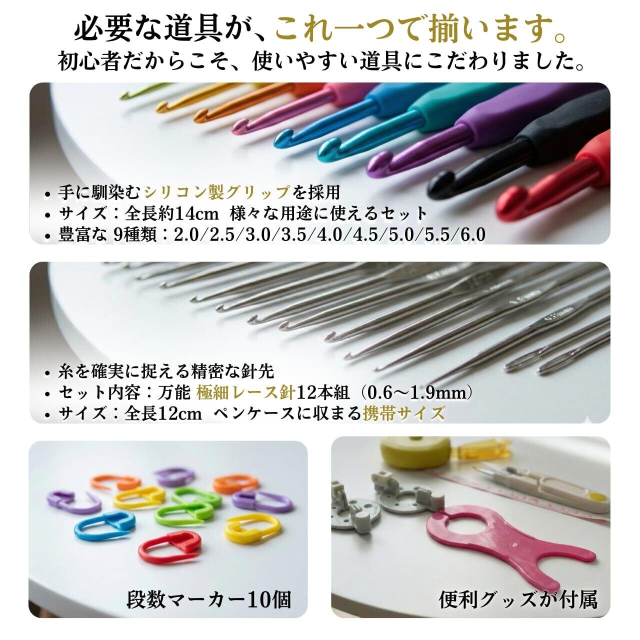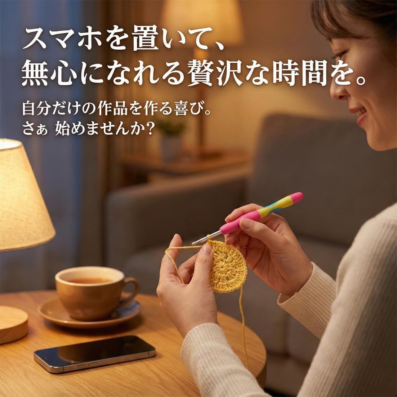 【使い分け可能な21本のかぎ針を同梱】 長時間編んでも手が疲れにくいソフトなシリコンハンドル付きかぎ針(9本)と、繊細なレース編みに適した鉄製かぎ針(12本)が付属し、これ一つで小物から大きな作品まで幅広く対応します。