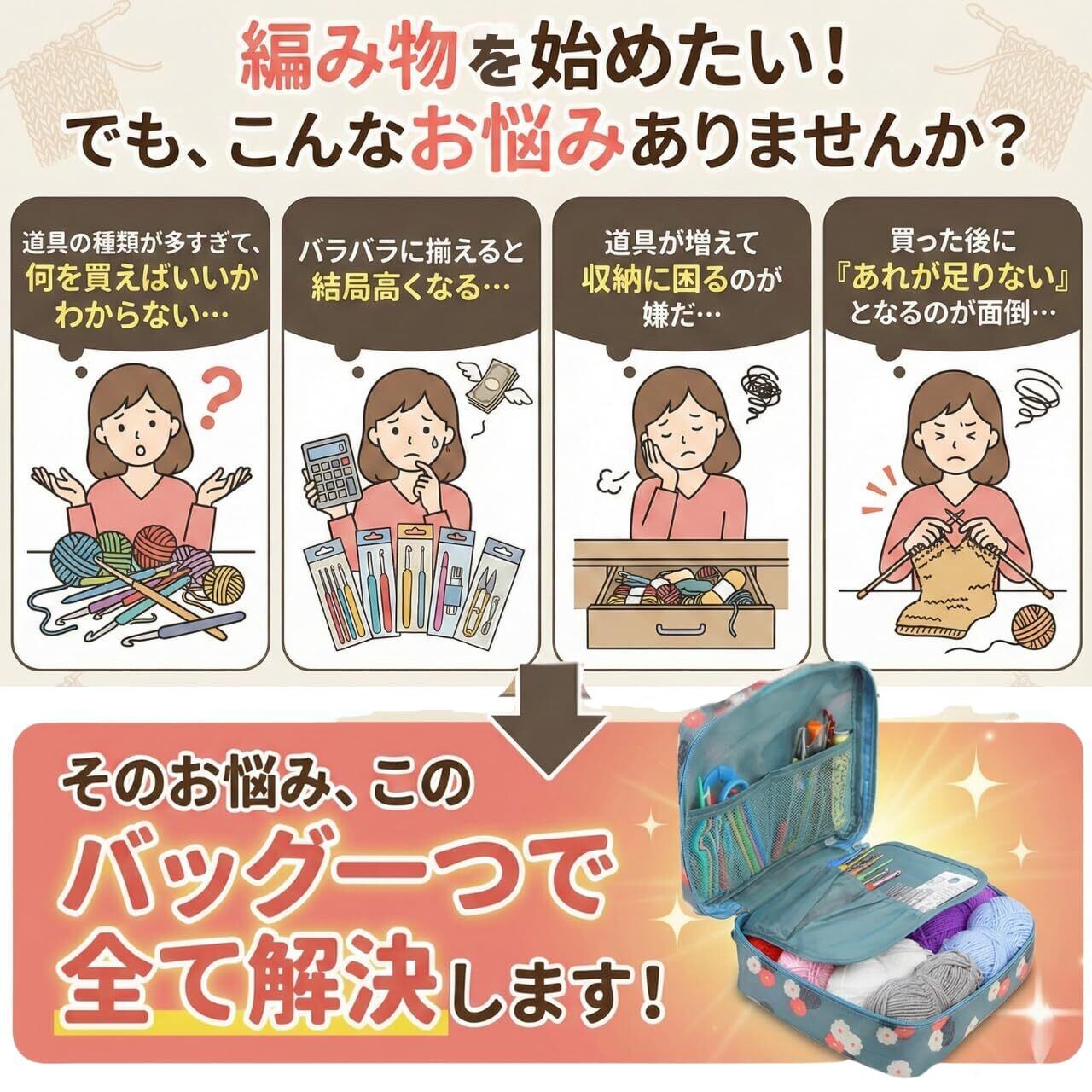 かぎ針編みセット 初心者向け スターターキット 届いてすぐ編めるフルセット 収納バッグ付き 毛糸付き 編み物フルセット かぎ針 手芸 大人の趣味 (北欧フラワーミント)