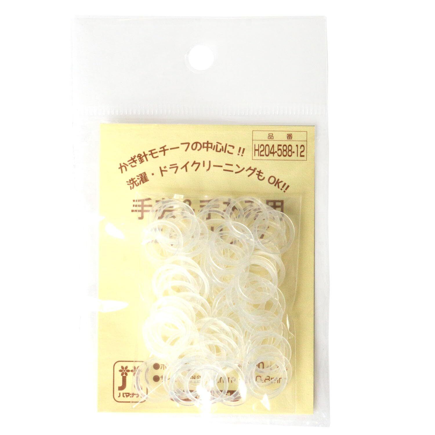かぎ針モチーフの中心に芯として使用します。洗濯、ドライクリーニングもOKで、被せ編みをするリングです。サイズ:外径12mm厚さ0.8mm内容:100個入り素材:ポリエチレン製。