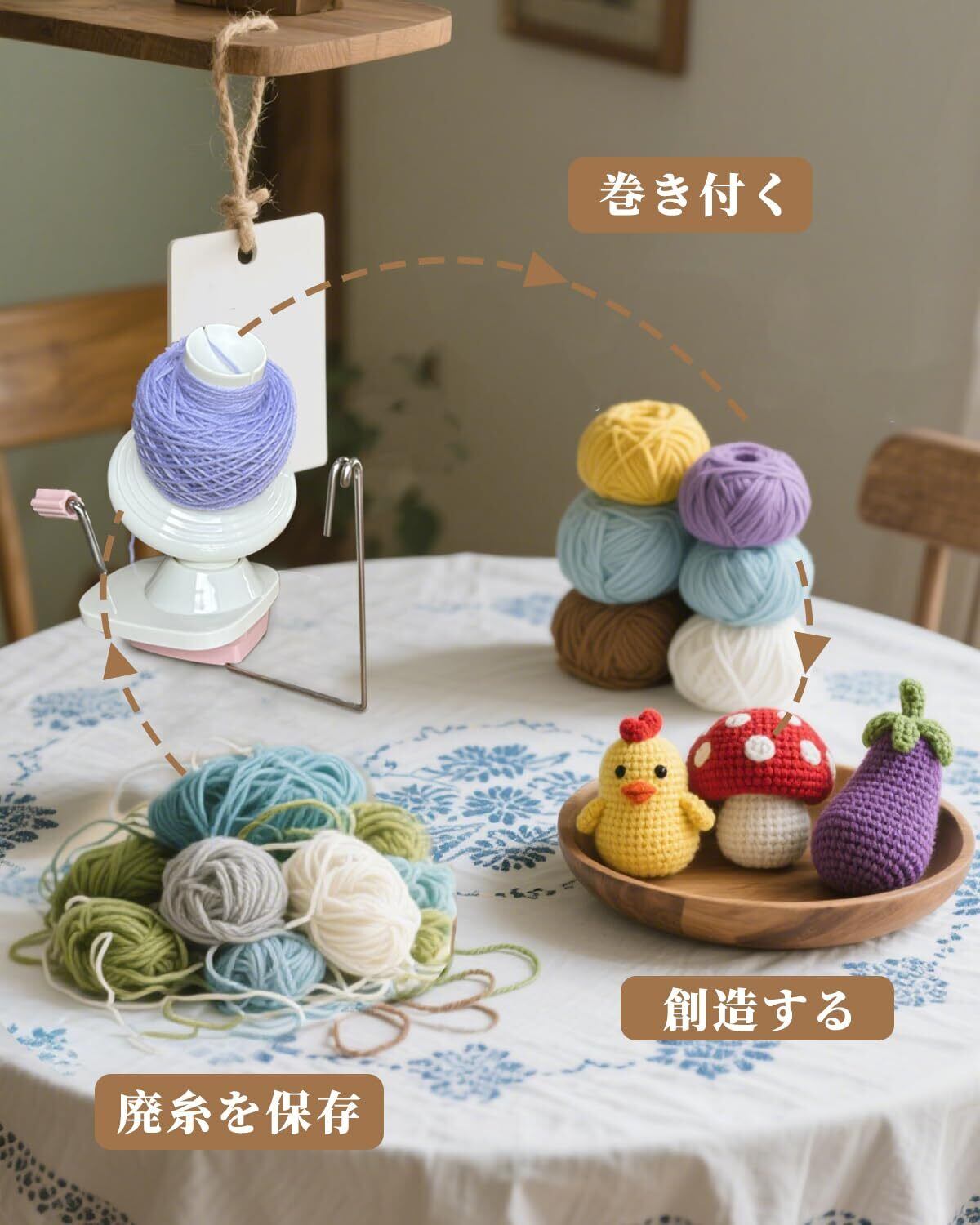 巻き取りが簡単:巻き取り器を使用すれば、糸を機械上でスムーズに丸い玉に巻き取ることができ、編み物やクロシェ編みがよりスムーズになります。