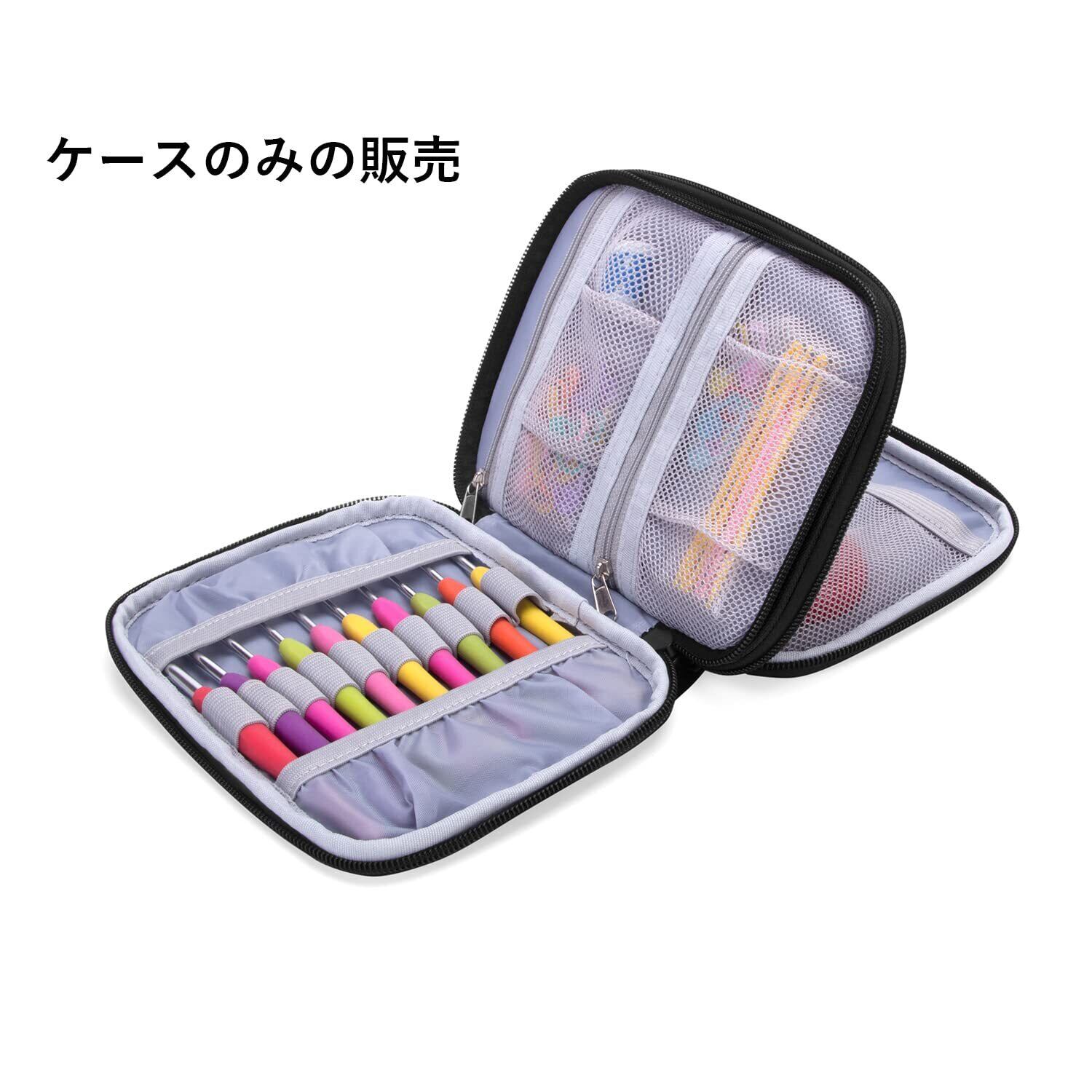 かぎ針編みに必要なかぎ針セット、アクセサリー(小さいはさみ、定規、段数マーカー、とじ針など)の保管と持ち運びに便利な収納ケースです。
