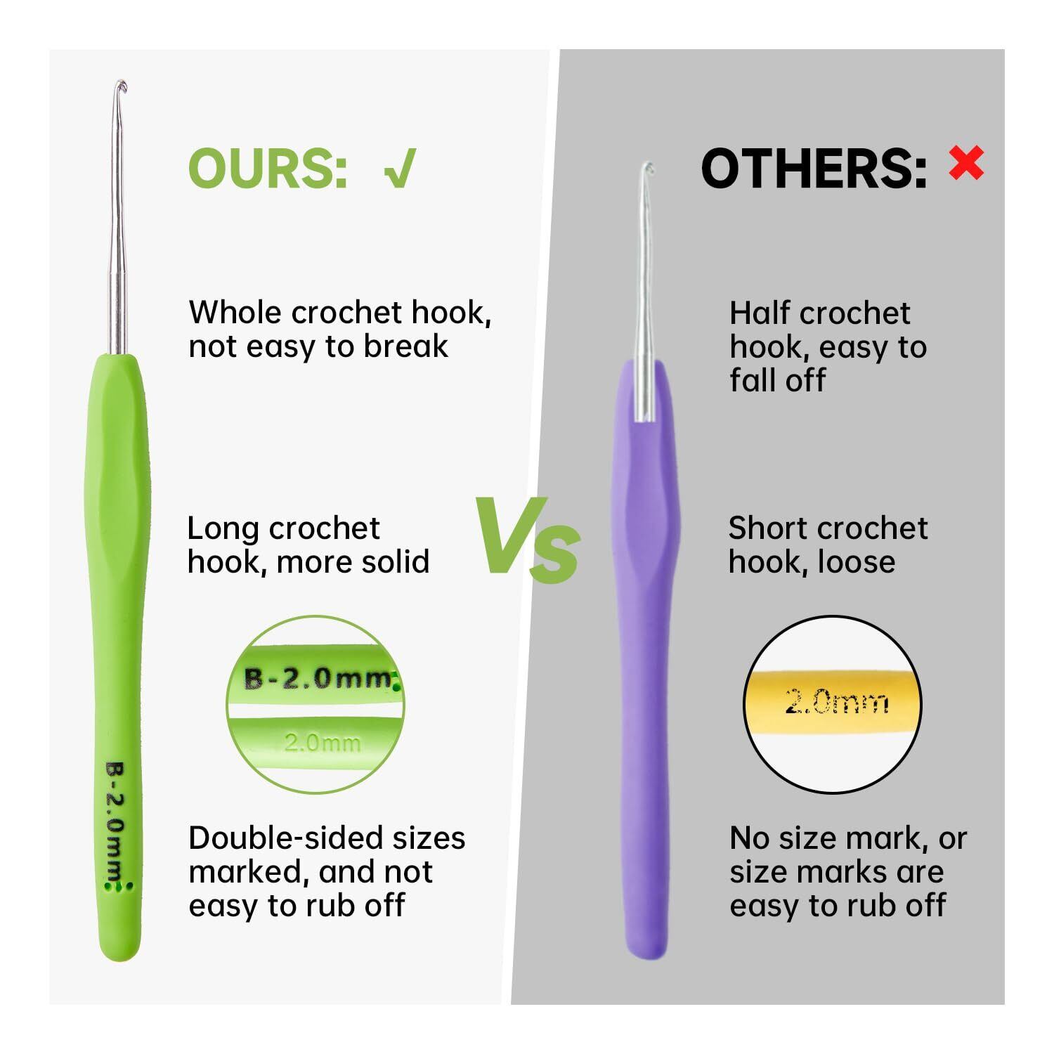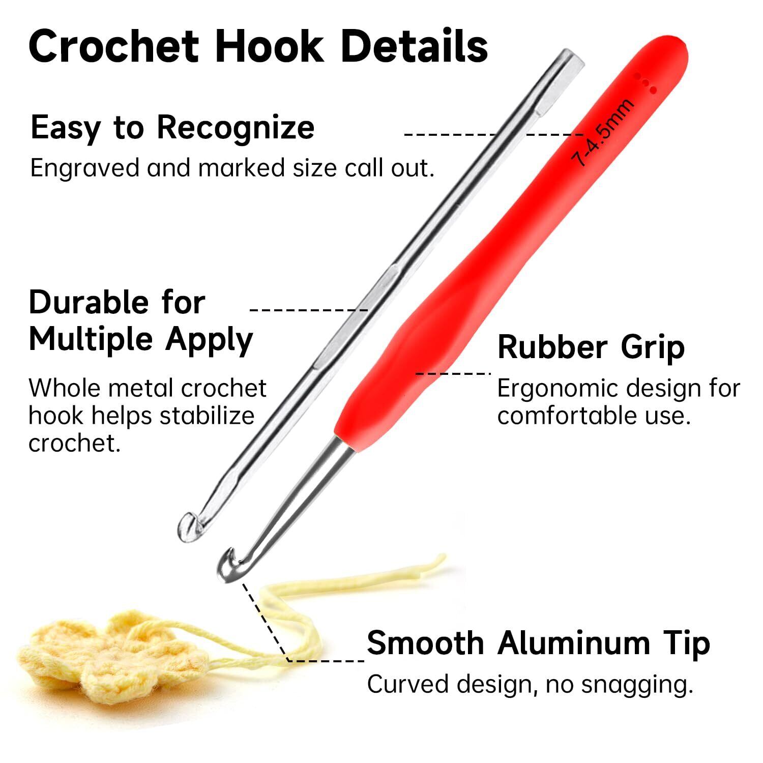 【入念に設計した鉤針】2.0mm、2.5mm、3.0mm、3.5mm、4.0mm、4.5mm、5.0mm、 5.5mm、6.0mm、7.0mm、8.0mm、9.0mm、10.0mm、合計13サイズのカギ針がセットに含まれています。針先は糸がはずれにくく、糸を引き抜いたりしやすい形状にデザインされていて、スムーズな編み心地です。ゴムで作られたグリップが太めで、柔らかくてすべりにくいから、長時間使っても疲れを感じずに、どんどん編めます。また、持ち手にみやすい号数表示があるので、毛糸の太さを合わせる手間も省けます。
