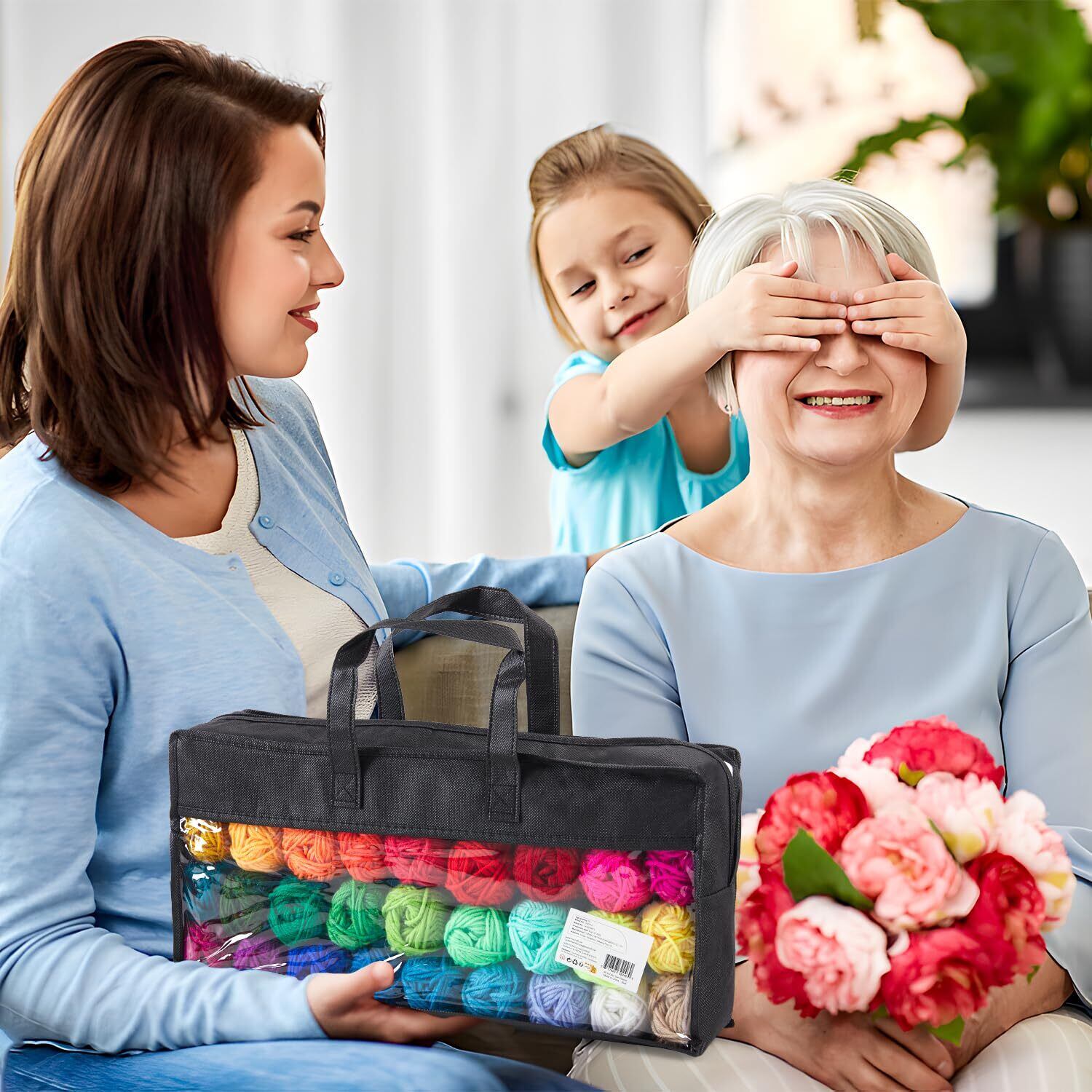 【セット内容】毛糸×40色(素材:100% アクリル、長さ・重量:1玉あたり約36.5m・16g、線径:2㎜)、カギ針×2(6㎜、6.5㎜)、とじ針×2、段数マーカー×4、収納ケース×1の手編み糸セットです。