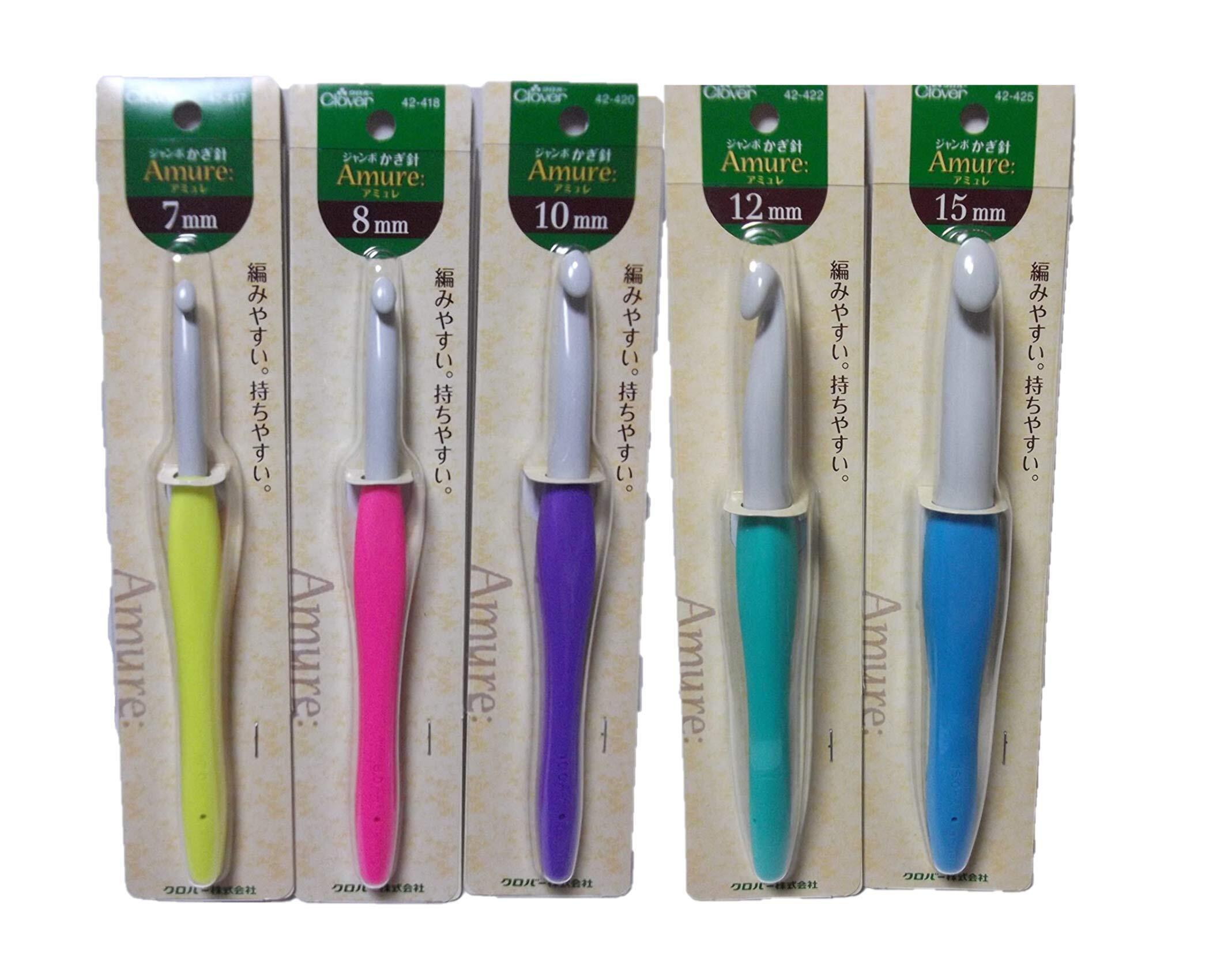 Clover ジャンボかぎ針 「アミュレ」5本セット(7・8・10・12・15mm)です。 こだわりの針先と持ちやすいグリップです。 太い糸がザクザク編めるので帽子、マフラー、インテリアなど小物作りにオススメです。 ●針先は、すべりの良い樹脂を使っています。軽いので、手に負担がかかりにくいです。 ●針先から糸がはずれにくく、目を拾ったり、糸を引き抜きやすい針先形状です。 ●手になじむソフトな素材と立体的なカーブで作られたグリップは、自然と指先にフィットし、持ちやすく疲れにくい設計になっています。