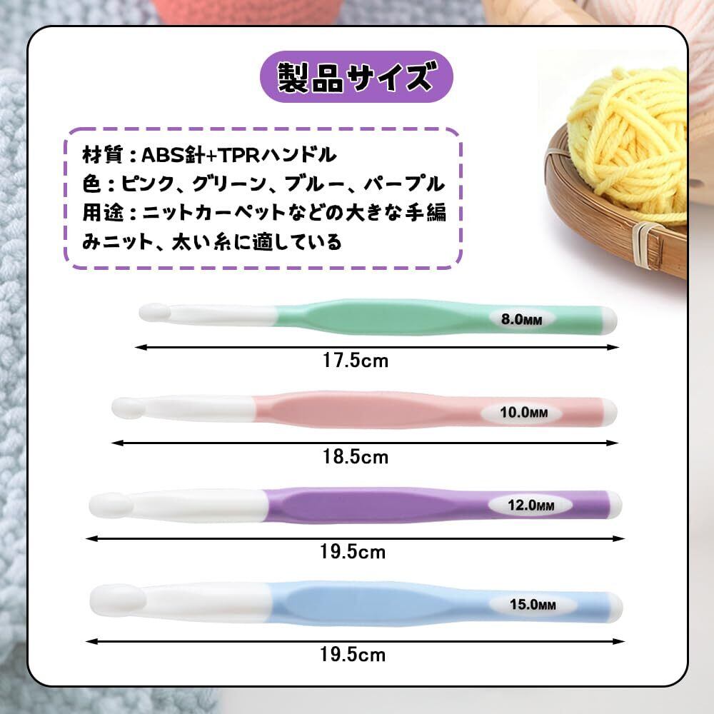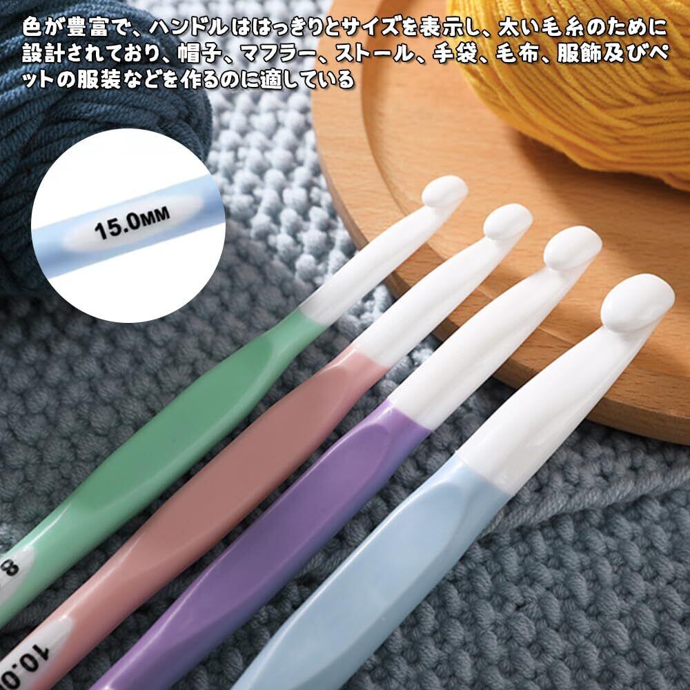 【多種の規格】セットは8mm、10mm、12mm、15mmの4種類のサイズの鉤針を含んで、色彩が豊富で、ハンドルにはっきりとサイズを表示して、初心者も簡単に区別して使うことができます。