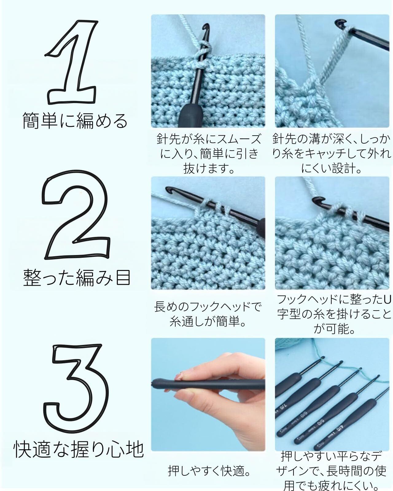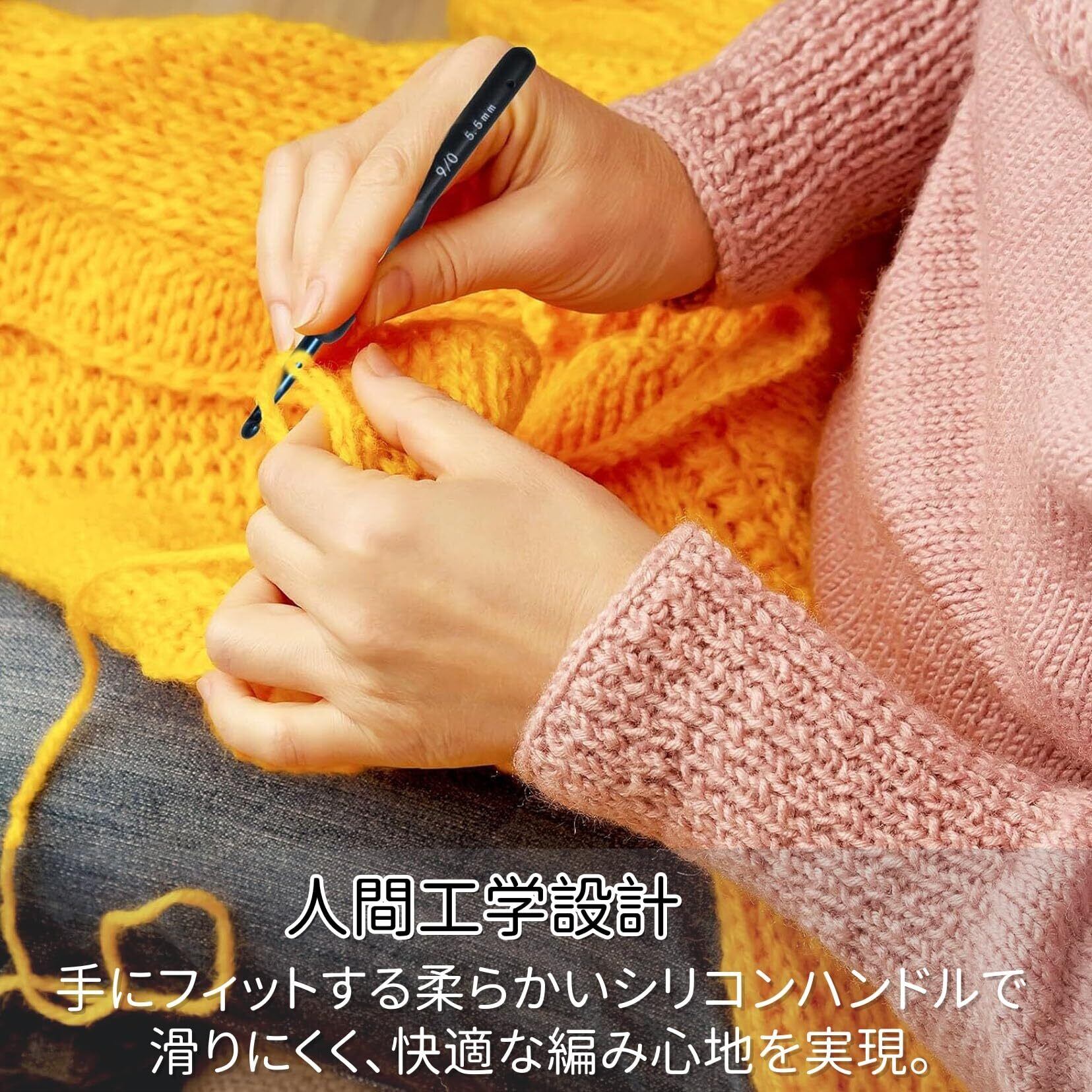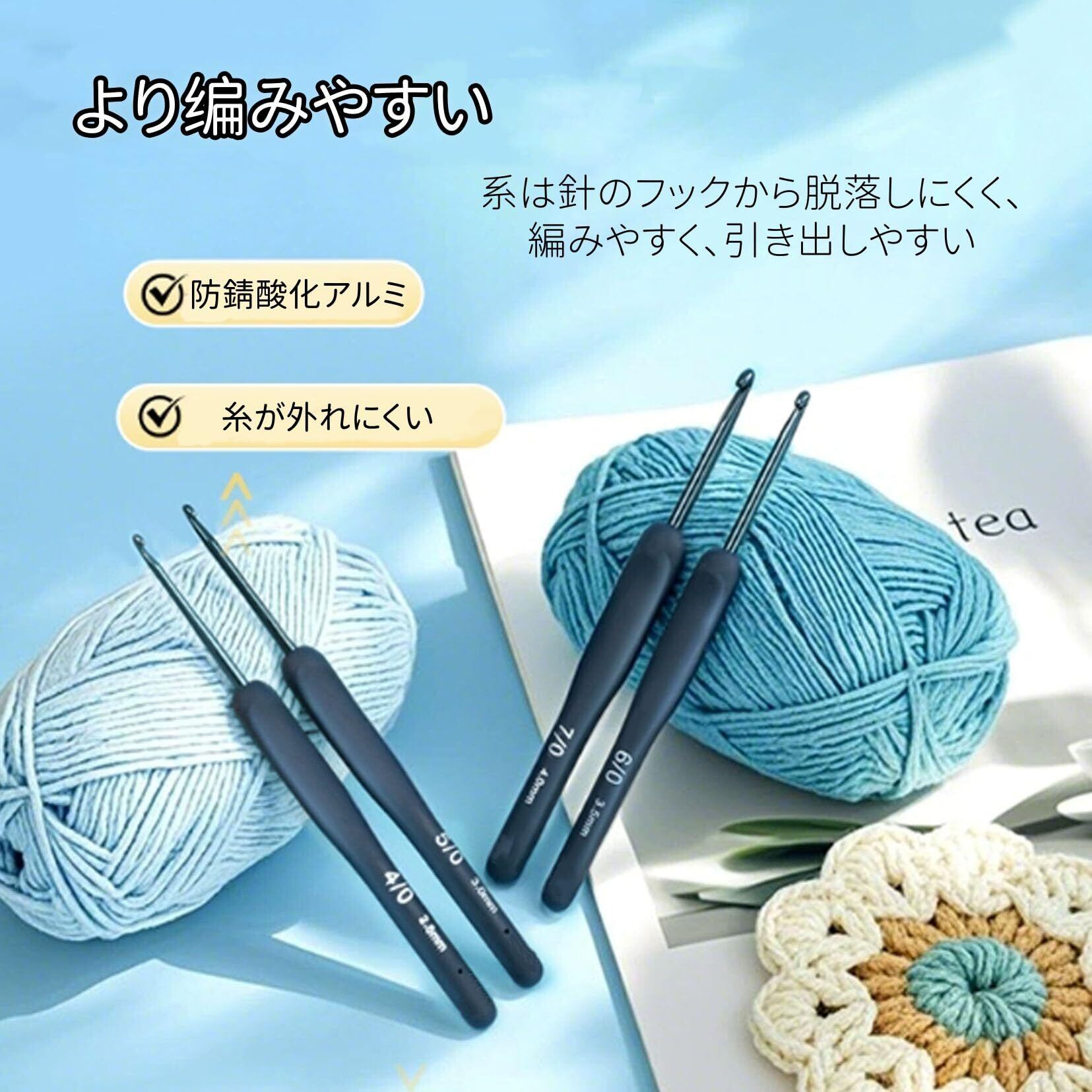 【高品質素材】アルミ製フック針を使用し、耐久性が高く、滑らかに研磨された針先が糸絡みを防ぎます。スムーズな編み心地を提供し、長期間の使用にも最適です。