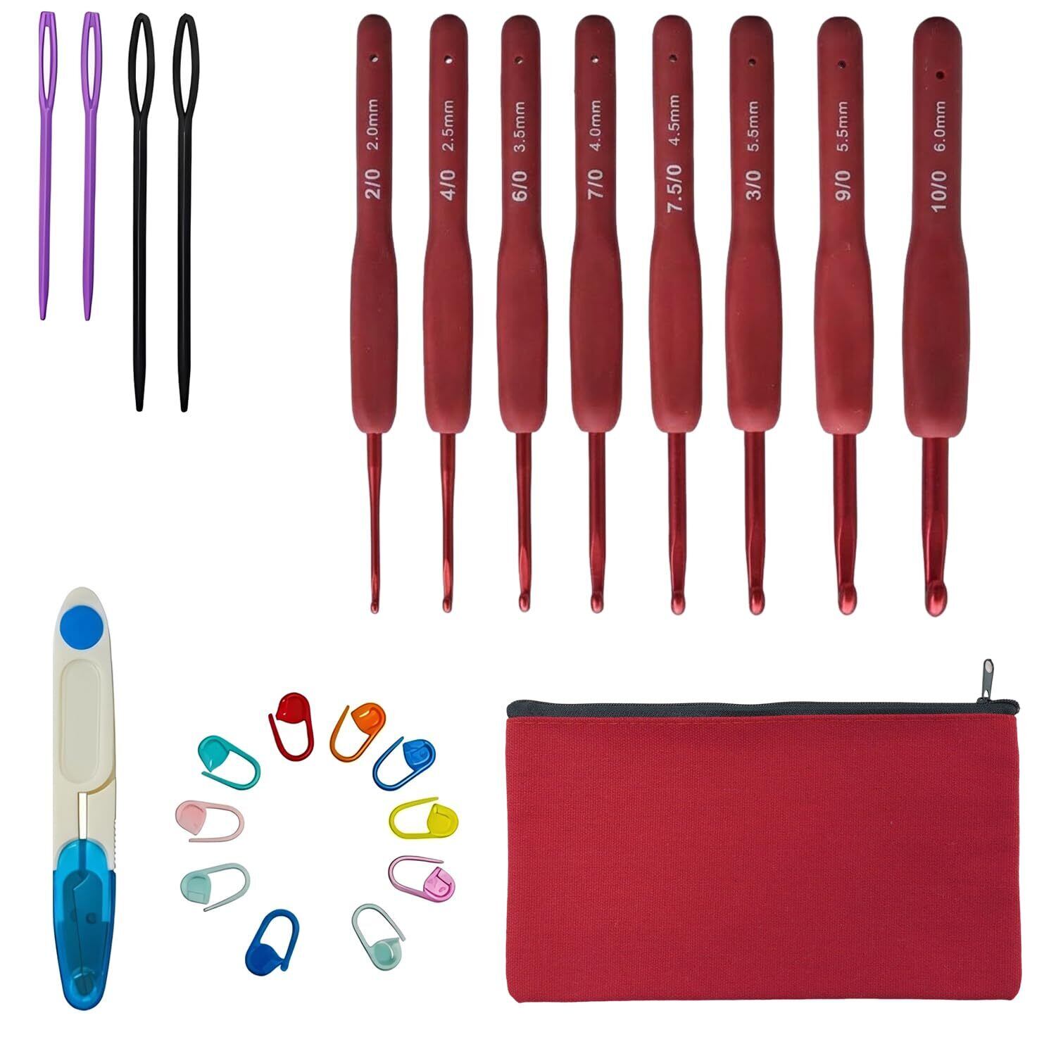 かぎ針編みキット かぎ針 9 本フルセット 初心者 DIY 工具 編み物手芸 基本入門キット 小物付き 糸カッター ポーチ 毛糸編み セーター マフラー マーキングバックル 24 点セット ネイビー (レッド)