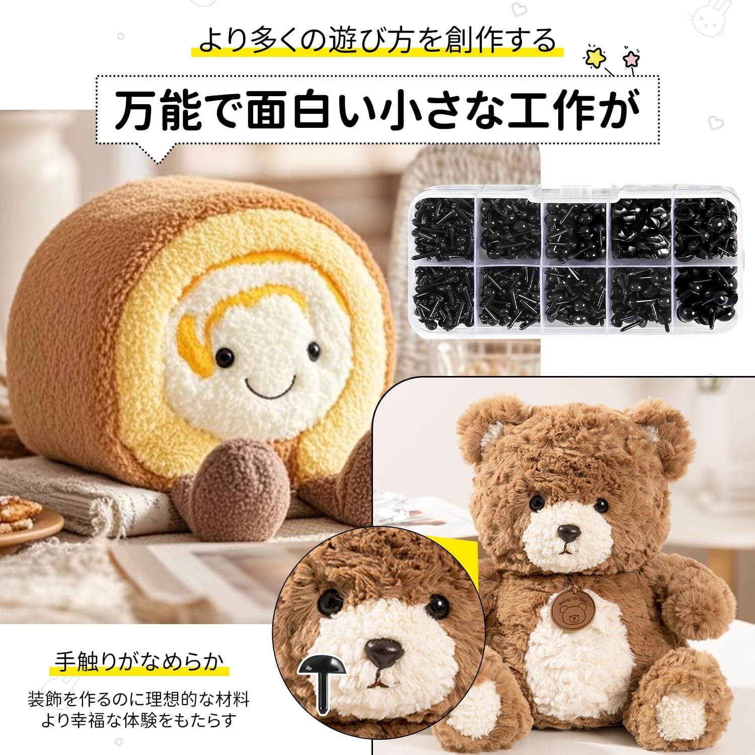 【1000個入り大容量 手作りにたっぷり】計1000個の目鼻パーツをセットでご用意(サイズ別個装)。これ1セットあれば、アニマルぬいぐるみの大量制作や複数のハンドメイド作品を同時進行しても、パーツ不足を気にする必要はありません。