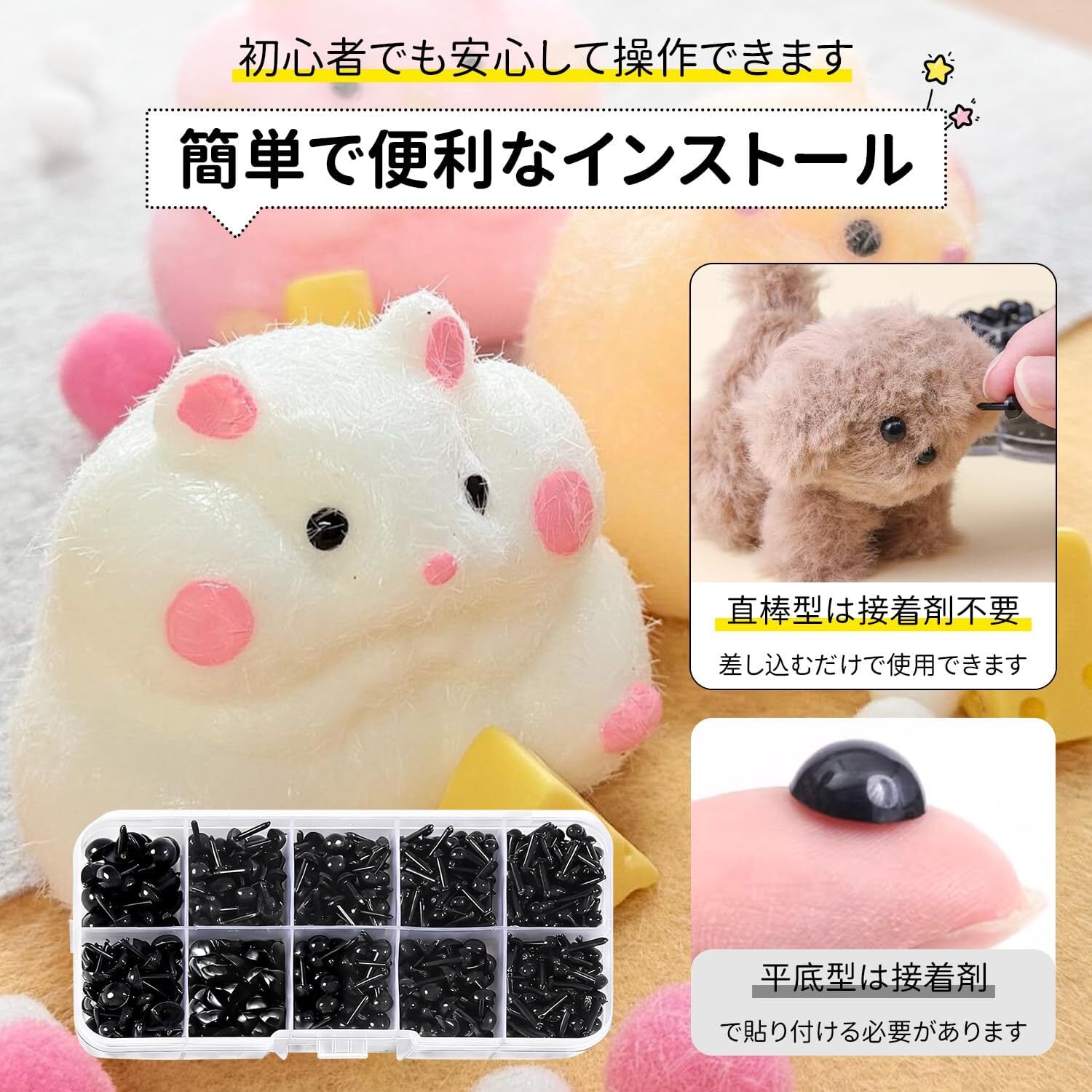【差し込むだけの簡単装着 初心者に優しい】特殊な工具や接着剤は不要。フェルトや布地に差し込むだけで簡単に固定できます。お子様の自由工作から本格的なハンドメイド販売作品作りまで、どなたでも手軽にご利用いただけます。